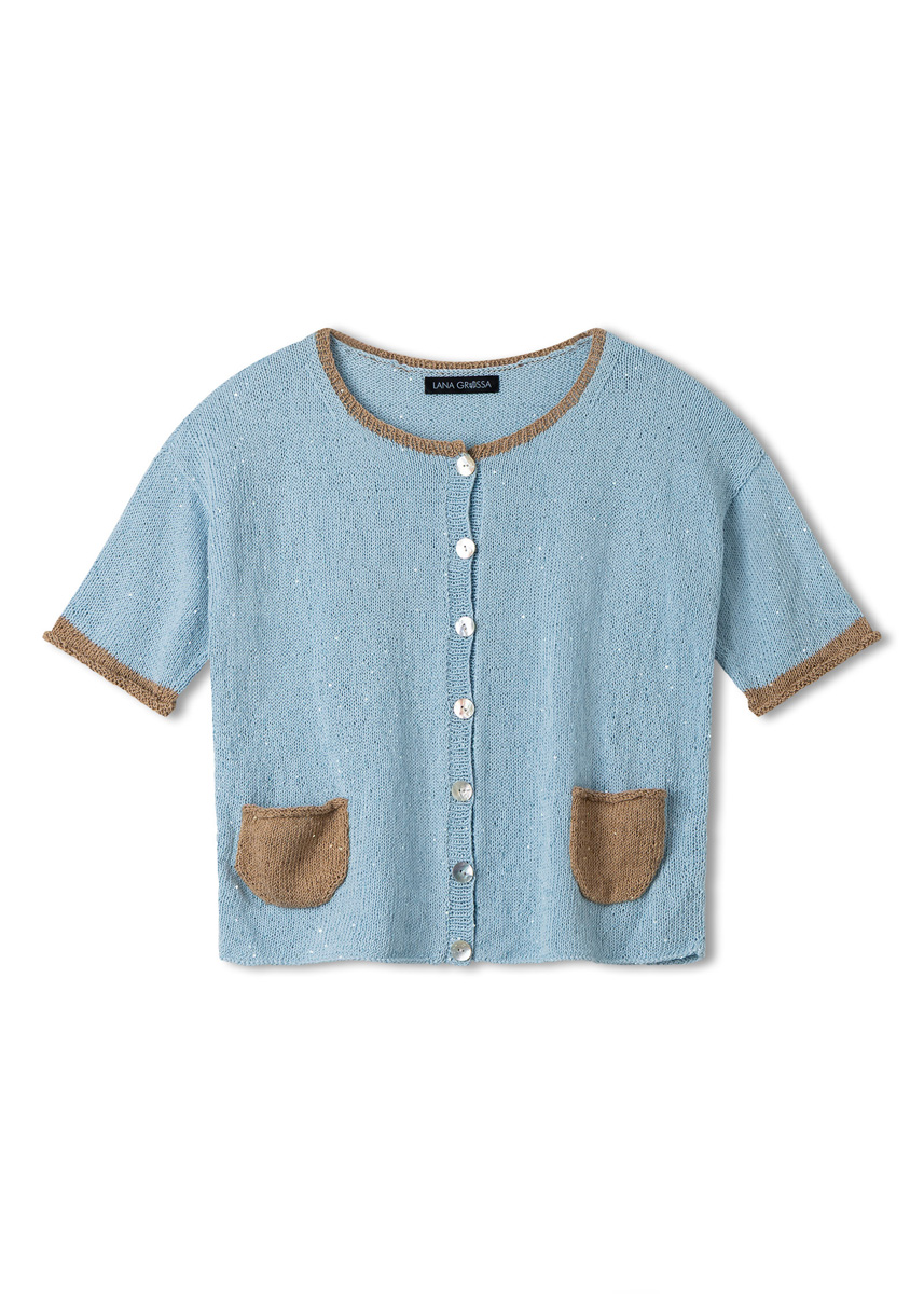 Lana Grossa Filo Paillettes (55% Baumwolle, 39% Polyester, 6% Polyamid, LL = ca. 155 m/50 g), 300 (350 - 400 - 450) g in Eisblau (Fb 9) und 50 g in Camel (Fb 17). Stricknd Nr. 2,5 und Nr. 3. 7 Perlmutt-Knöpfe, Artikel 37604 in Perlmutt (Fb 12 611), 18 mm Ø von Union Knopf.