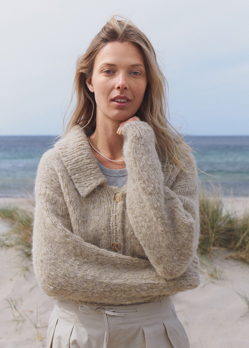 Großzügiger Ausschnitt, Umlegekragen und eine extrakurze Form – so sieht eine coole Jacke aus. Für die Grobstrick-Optik arbeitet man doppelfädig. Ansonsten wird das Modell klassisch, also von unten nach oben gestrickt. Kragen, Knöpfe und Ärmel annähen, fertig.
