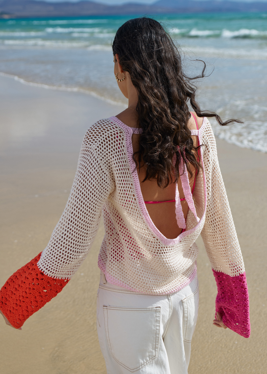 Lana Grossa-Qualität „Campo” (65 % Baumwolle, 25 % Viskose, 10 % Leinen, LL = ca. 165 m/50 g): ca. 250 g Creme (Fb. 2) und je ca. 50 g Leuchtendrot (Fb. 16), Pink (Fb. 18) und Rosé (Fb. 21); 1 Wollhäkelnadel Nr. 3,5.