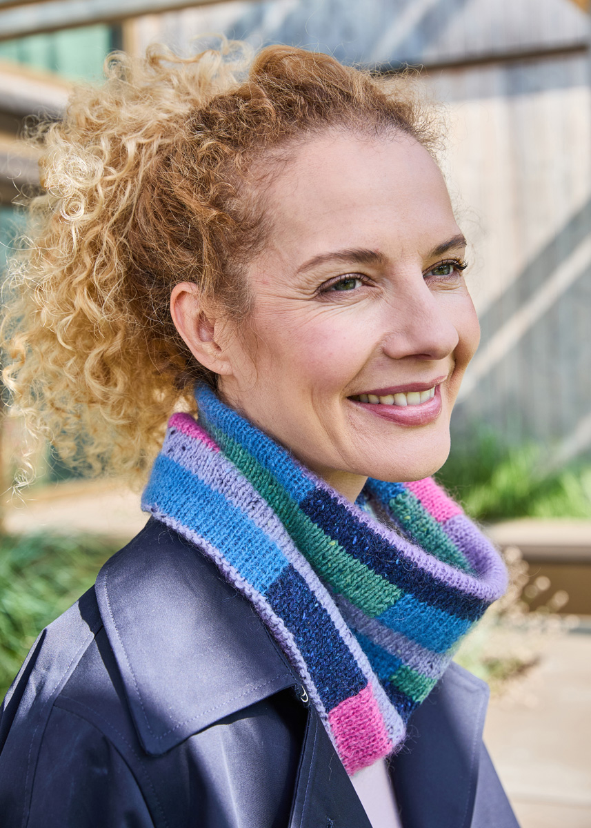 Lana Grossa-Qualität „Landlust- Kidmohair“ (70 % Mohair Superkid, 30 % Baumwolle, LL ca. 225 m/25 g), je 25 g in Taubenblau (Fb 9), in Mintgrün (Fb 6), in Pink (Fb 12) und in Graulila (Fb 13) und „Landlust-Soft- Tweed 180“ (100 % Schurwolle (Merino), LL ca. 180 m/50 g), je 50 g in Graublau Meliert (Fb 126), in Jade Meliert (Fb 127) und in Dunkelblau Meliert (Fb 114); Stricknadeln Nr. 4,5.