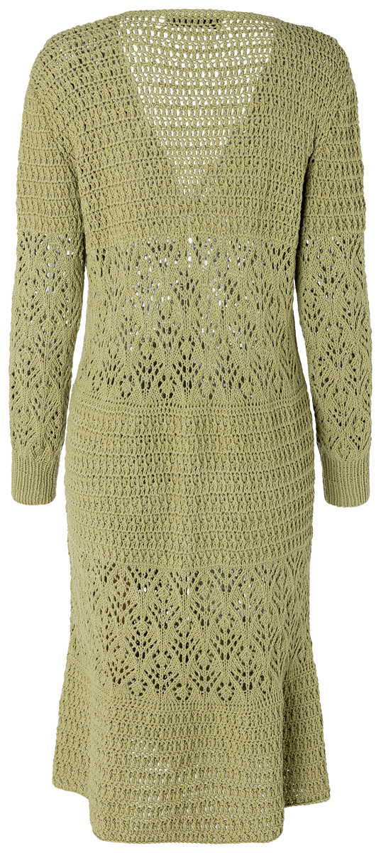 Lana Grossa-Qualität „Elastico” (96 % Baumwolle, 4 % Polyester (Elité), LL = ca. 160 m/50 g): ca. 650 g Heugrün (Fb. 166); je 1 Wollhäkelnadel Nr. 3,5, 4 und 4,5, Stricknadeln Nr. 3,5, 4 und 4,5; 3 farblich passende Knöpfe, ø 20 mm.