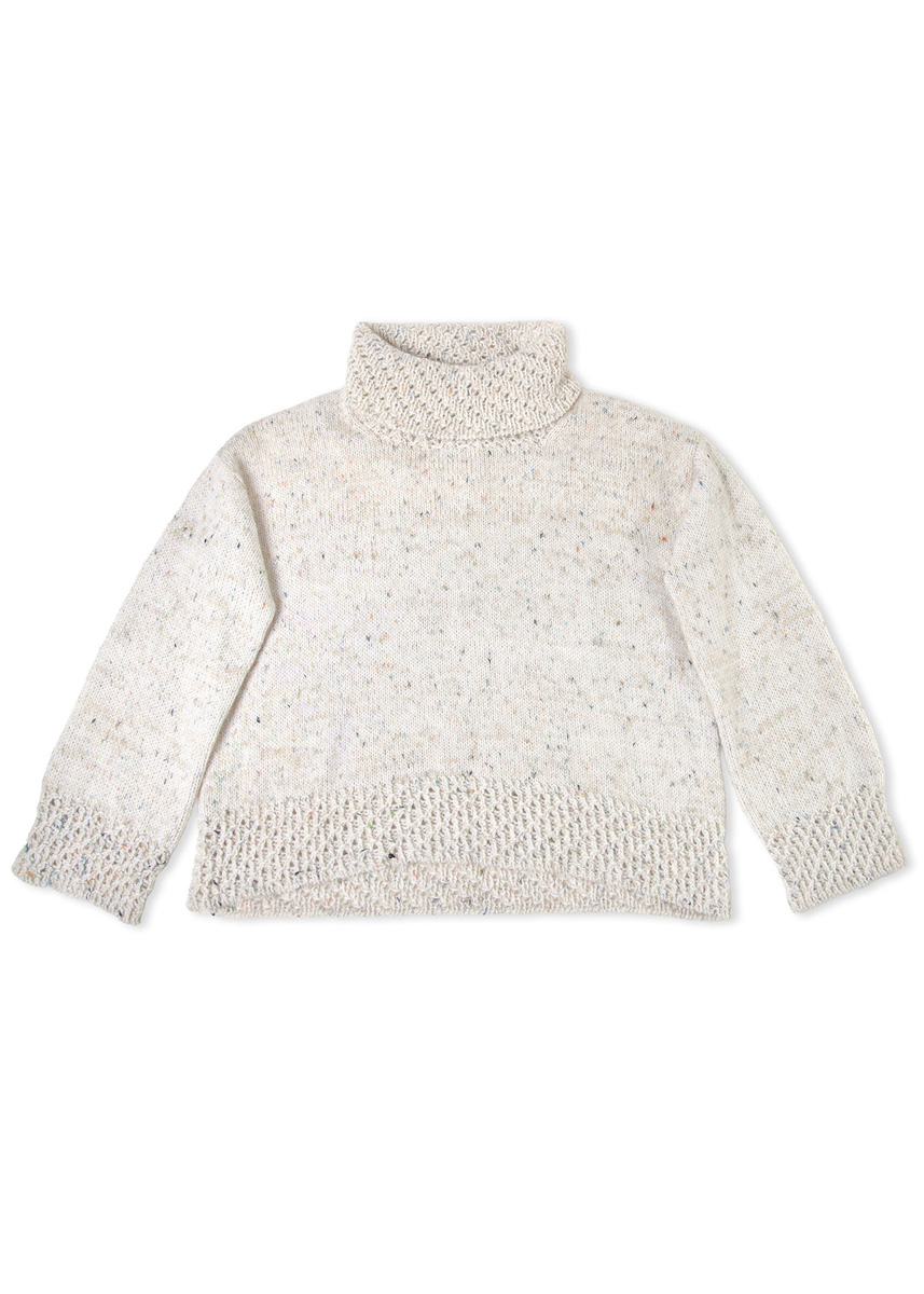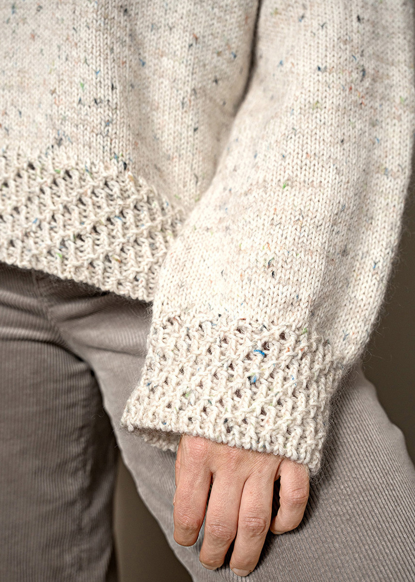 Midnight Drive wird nahtlos, glatt rechts und von oben nach unten in einem Stück gearbeitet – teils in Reihen, teils in Runden. Zunächst werden Maschen für das Rückenteil angeschlagen, seitliche Zunahmen formen Schultern und die obere Rückenpartie. Nach Erreichen der Armausschnitthöhe werden die Rückenmaschen stillgelegt. Anschließend werden entlang der rechten und linken Schulternaht Maschen aufgenommen und die beiden Vorderteile separat gestrickt; gleichzeitig formt sich der Halsausschnitt durch Zunahmen. Sobald die gewünschte Halsausschnitttiefe erreicht ist, werden die Vorderteile verbunden und bis zur Armausschnitthöhe in Reihen weitergearbeitet. Danach werden Vorder- und Rückenteil zusammengeführt und in Runden bis zum Bündchen gestrickt; ein feines Strukturmuster bildet den Abschluss. Für die Ärmel werden direkt aus den Armlochöffnungen Maschen aufgenommen und durch verkürzte Reihen werden die Schultern geformt, anschließend wird in Runden weiter gearbeitet, seitliche Abnahmen geben den Ärmeln die Form; auch hier rundet das Strukturmuster den Abschluss ab. Der nachträglich angestrickte, hohe Rollkragen greift das Motiv auf und fällt beim Tragen mühelos nach innen.