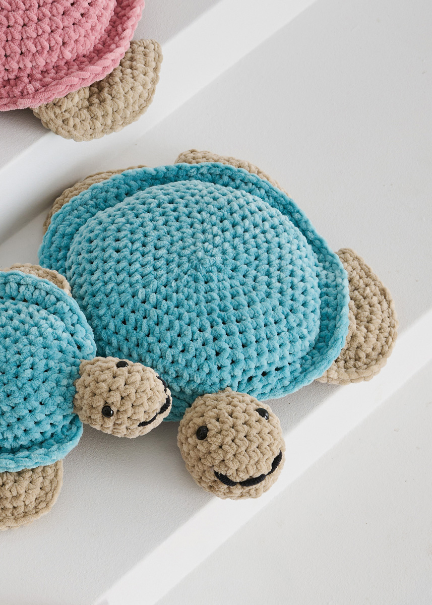 Lana Grossa The Look (100% Polyester; LL = 120 m/100 g): je 100 g Minttürkis (Fb. 25), Beige (Fb. 23), Nougat (Fb. 12) und Schwarz (Fb. 13); eine Häkelnadel 7 mm; Sicherheitsaugen mit 12 mm Ø; Baumwollstoff (feste Webware), ca. 30 cm x 60 cm; Füllwatte.