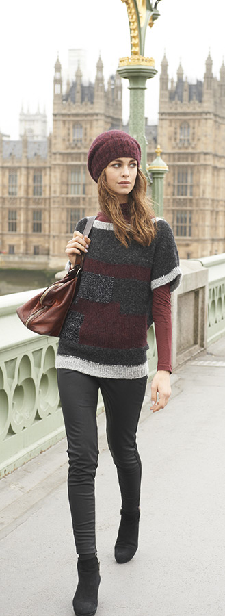 Lana Grossa-Qualität „Garzato Fleece” (70 % (Baby) Alpaka, 30 % Polyamid, LL = ca. 225 m/50 g): ca. 50 g Weinrot/Schwarz (Fb. 8); Spielstricknadeln Nr. 3,5 und 4.