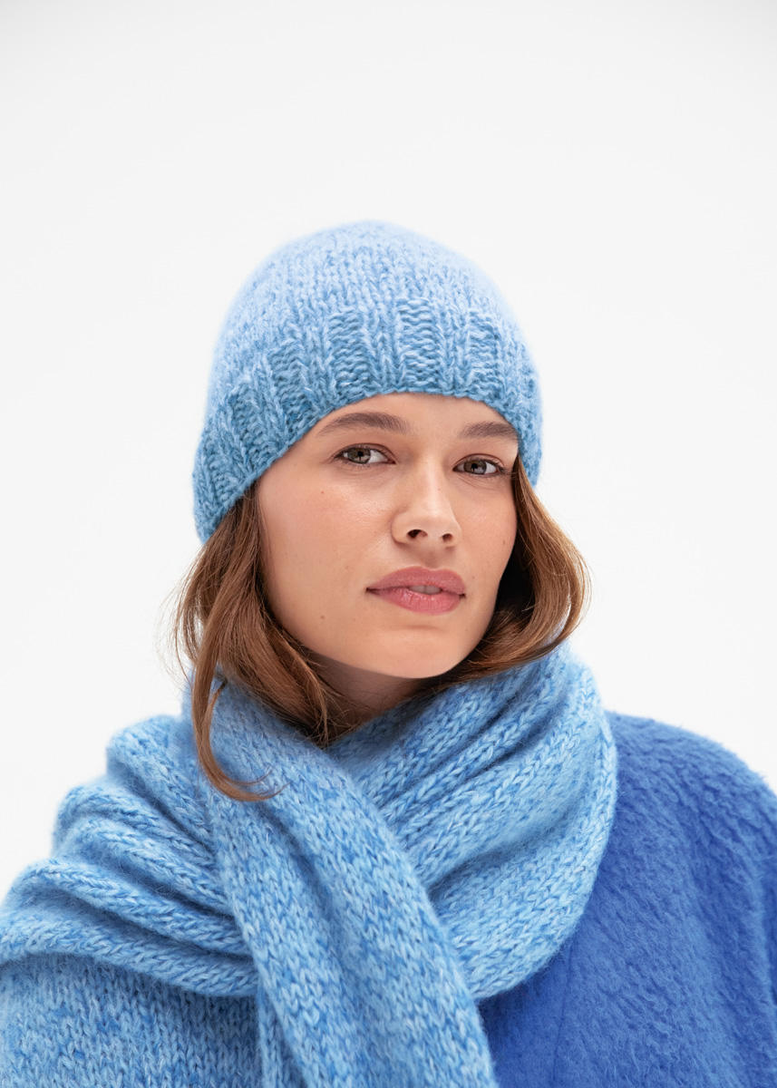 Lana Grossa „Nebbia“ (55% Schurwolle (Merino extrafine), 45% (Baby) Alpaka, LL = 170 m/50 g): 50 g Hellblau (Fb 6) und Lana Grossa „Setasuri“ (69% Alpaka (Suri), 31% Seide, LL = 212 m/25 g): je 25 g Hellblau (Fb 14) und Kornblume (Fb 37); Nadelspiel Nr 6.