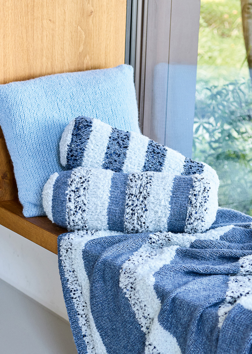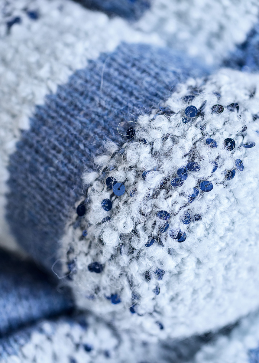 Lana Grossa- Qualität „Orsetto” (60 % Schurwolle (Merino), 40 % Alpaka (superfine), LL = ca. 75 m/50 g): ca. 100 g Weißblau (Fb. 1), Lana Grossa- Qualität „Brigitte No. 2” (47 % (Baby) Alpaka, 45 % Baumwolle, 8 % Schurwolle (Merino), LL = ca. 140 m/50 g): ca. 50 g Jeans (Fb. 6) und Lana Grossa-Qualität „Cosmo” (100 % Baumwolle (plus Pailletten),