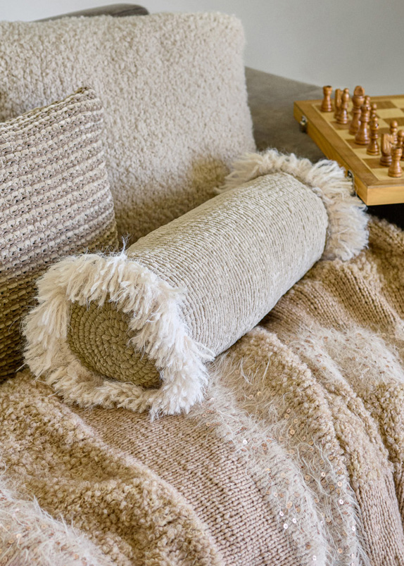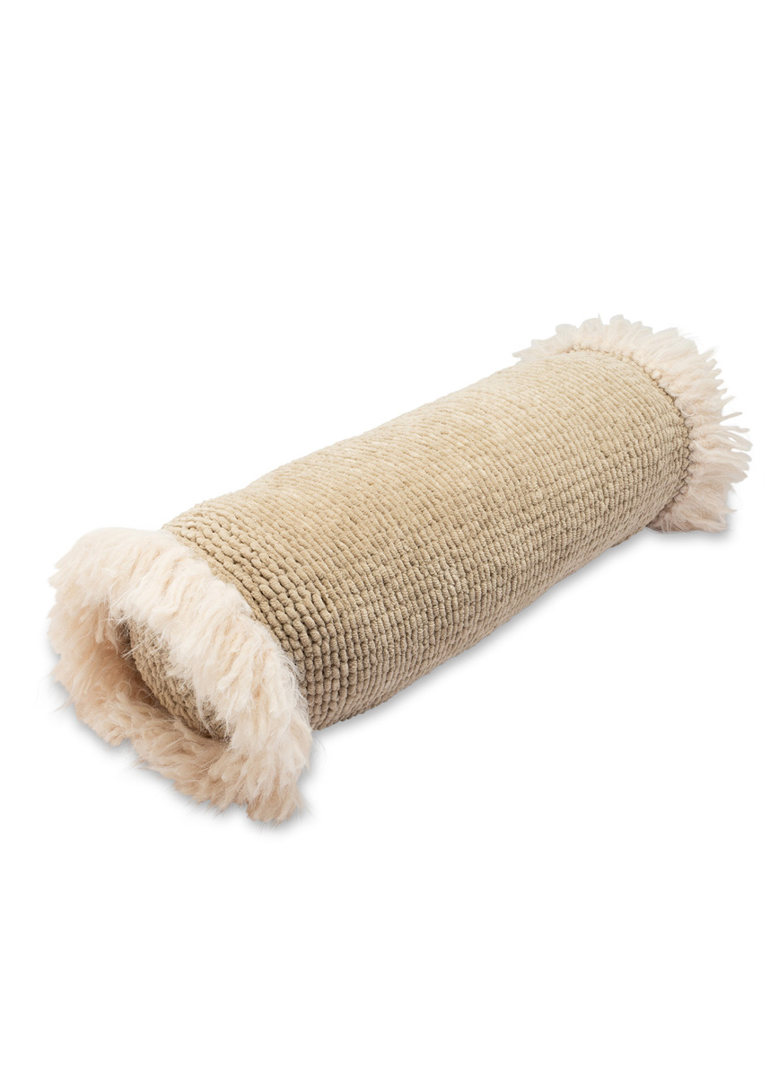 Lana Grossa-Qualität „The Look” (100 % Polyester, LL = ca. 120 m/100 g): ca. 200 g Beige (Fb. 23) und Lana Grossa-Qualität „Basta” (50 % Schurwolle (Merino), 50 % Polyamid, LL = ca. 100 m/50 g): ca. 50 g Hellbeige (Fb. 2); 1 Wollhäkelnadel Nr. 6, Stricknadeln Nr. 5; 1 Nackenrolle, 40 x 15 cm ø.