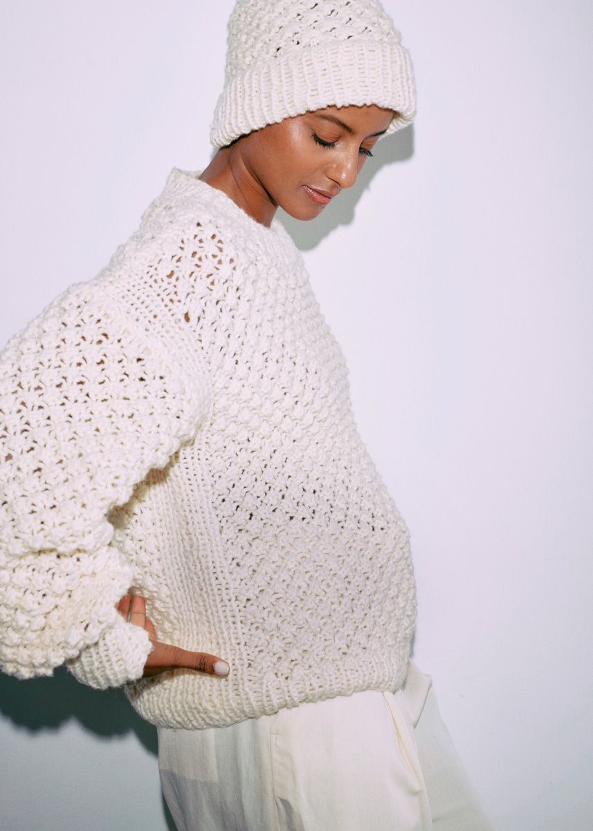 Lana Grossa-Qualität „Lala Berlin Lovely Cotton“ (75 % Schurwolle (Merino superfein), 25 % Baumwolle, LL = ca 90 m/50 g): ca 550 (600 - 650 - 700) g Rohweiß (Fb 33); Stricknadeln Nr 9; 1 kurze Rundstricknadel Nr 9.