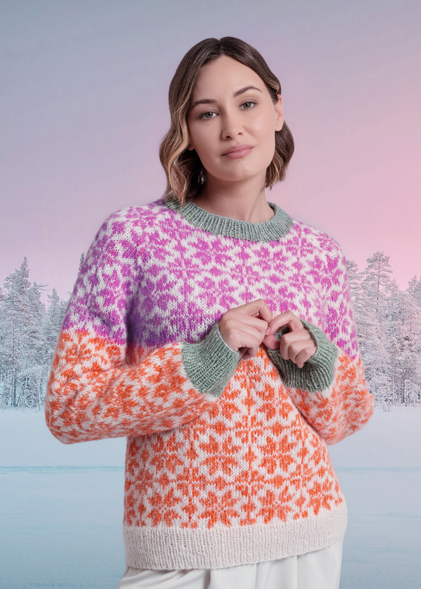 Rücken- und Vorderteil werden bis zu den Armausschnitten in Runden gestrickt und dann getrennt beendet. Die Ärmel werden ebenfalls bis zur Raglanschräge in Runden gestrickt. Das Modell hat eine Gesamtlänge von 61 (63 - 65 - 67 - 69 - 71) cm und eine Brustmehrweite von 15 cm bei 80 cm Brustumfang (16 cm bei 88 cm Brustumfang - 8 cm bei 96 cm Brustumfang - 10 cm bei 104 cm Brustumfang - 7 cm bei 116 cm Brustumfang - 5 cm bei 128 cm Brustumfang).