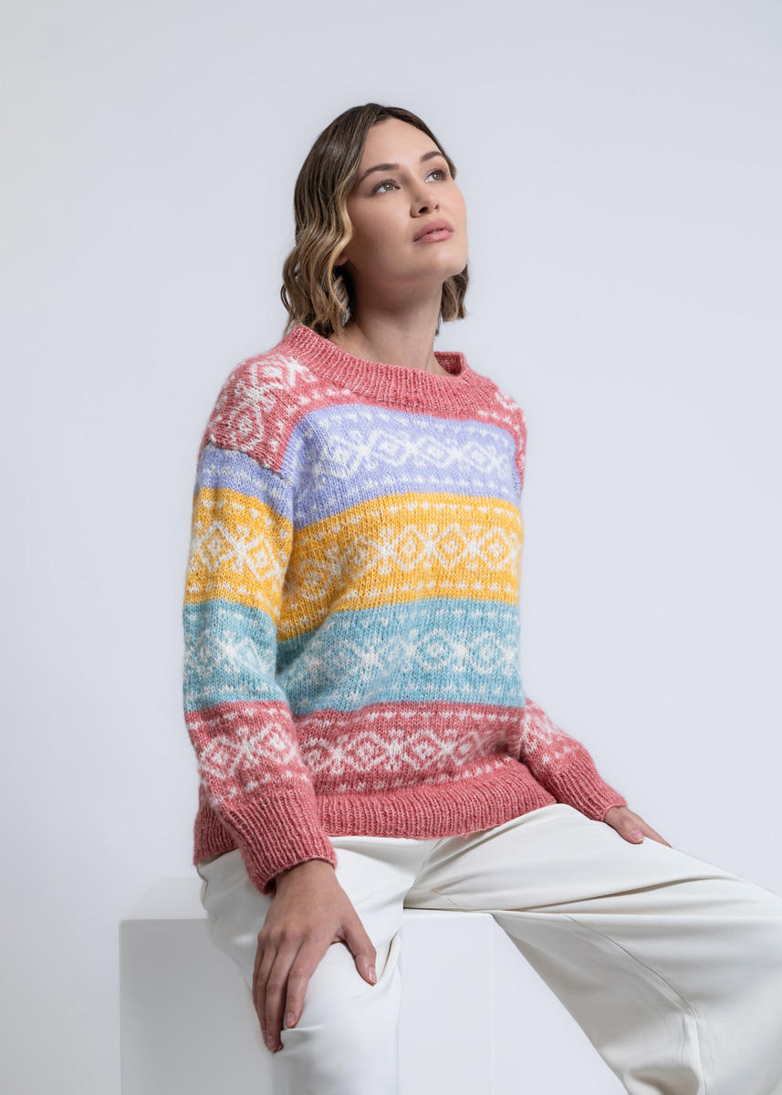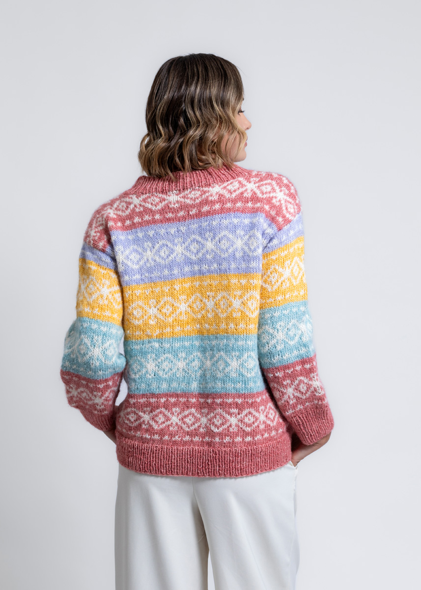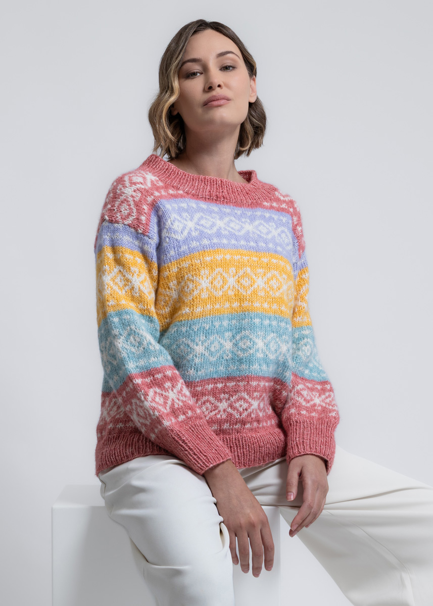 Der Pullover wird von unten nach oben und bis zu den Armausschnitten in Runden gestrickt. Das Modell hat eine Gesamtlänge von 60 (62 - 64 - 66 - 68 - 70) cm und eine Brustmehrweite von 14 cm bei 80 cm Brustumfang (12 cm bei 88 cm Brustumfang - 10 cm bei 96 cm Brustumfang - 16 cm bei 104 cm Brustumfang - 10 cm bei 116 cm Brustumfang - 10 cm bei 128 cm Brustumfang).