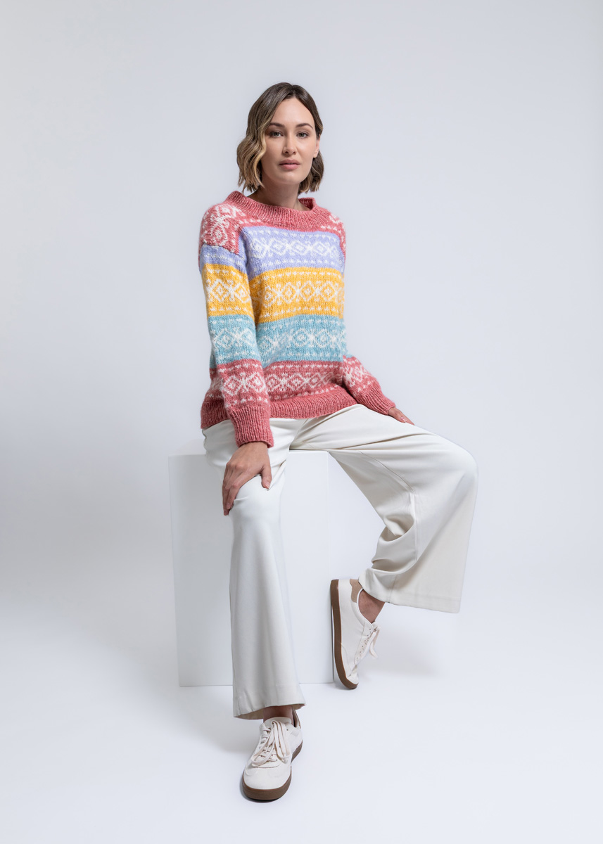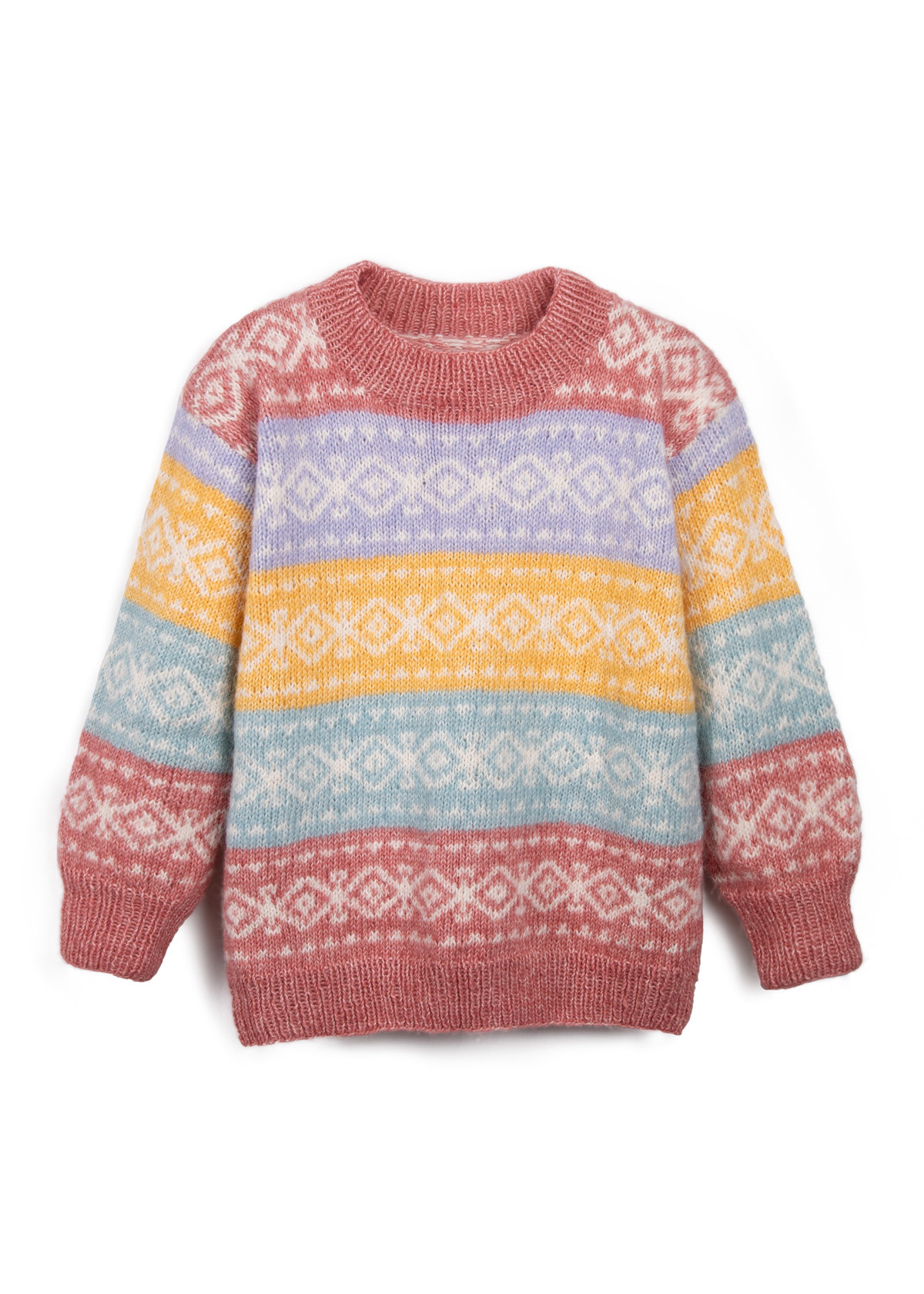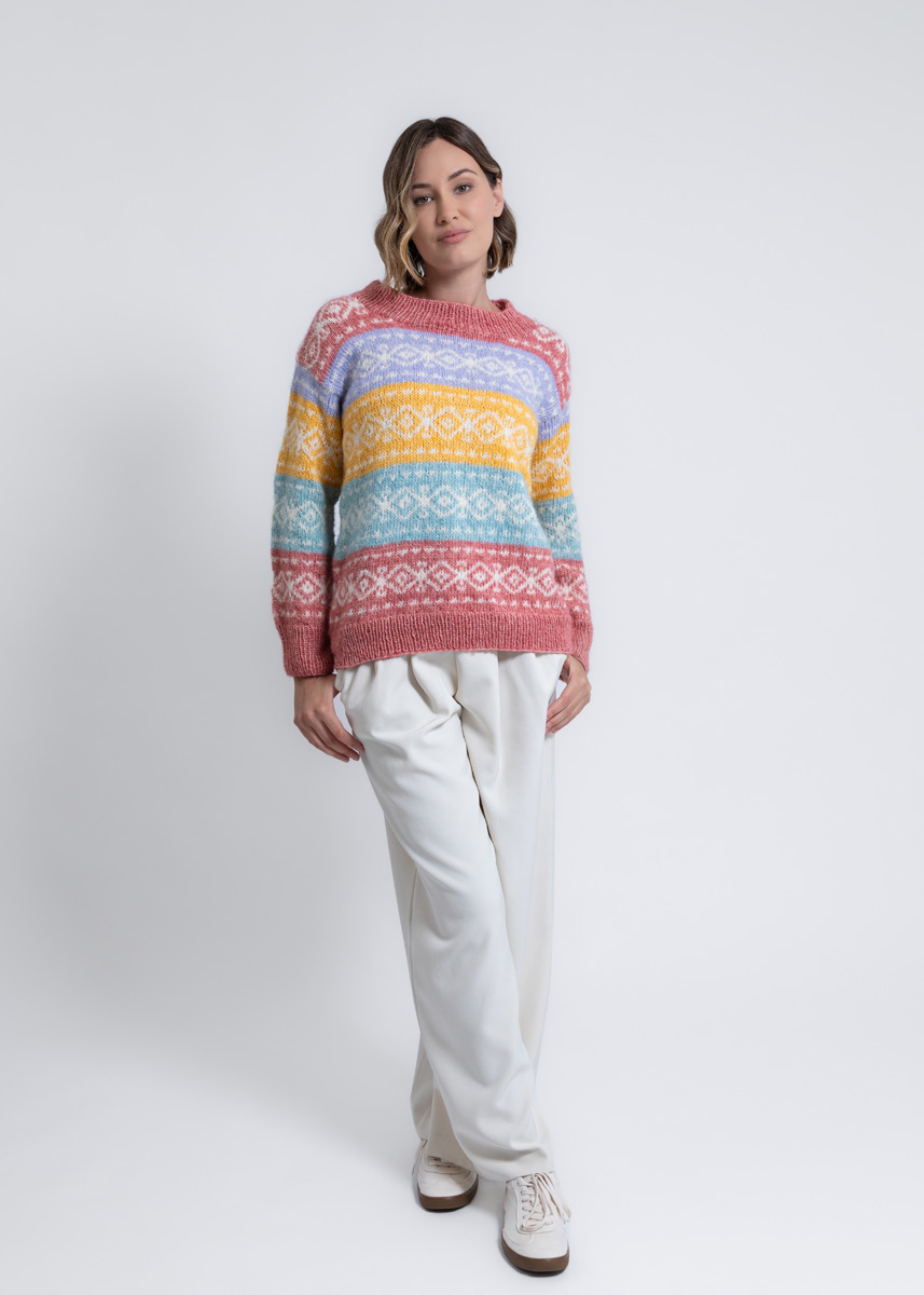 Der Pullover wird von unten nach oben und bis zu den Armausschnitten in Runden gestrickt. Das Modell hat eine Gesamtlänge von 60 (62 - 64 - 66 - 68 - 70) cm und eine Brustmehrweite von 14 cm bei 80 cm Brustumfang (12 cm bei 88 cm Brustumfang - 10 cm bei 96 cm Brustumfang - 16 cm bei 104 cm Brustumfang - 10 cm bei 116 cm Brustumfang - 10 cm bei 128 cm Brustumfang).