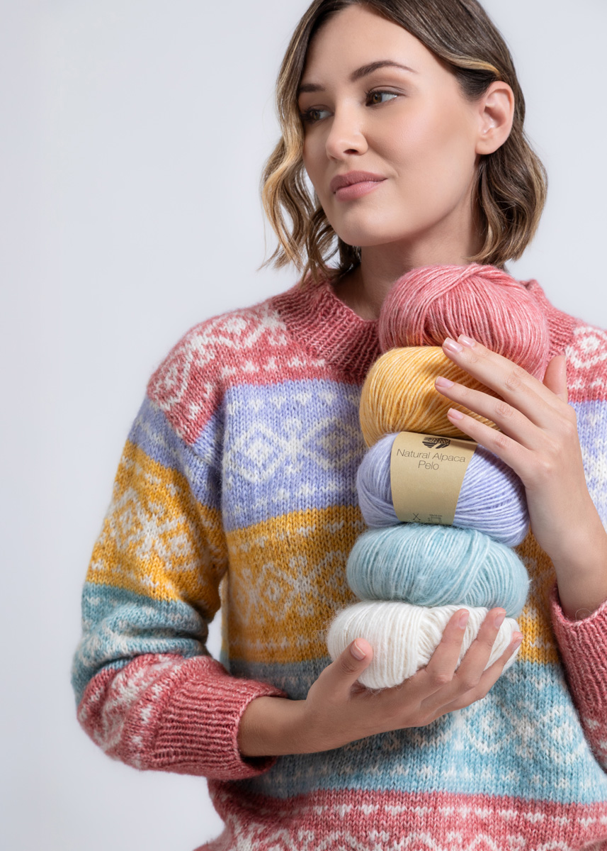63 % Baumwolle, 31 % Alpaka, 6 % Schurwolle Merino