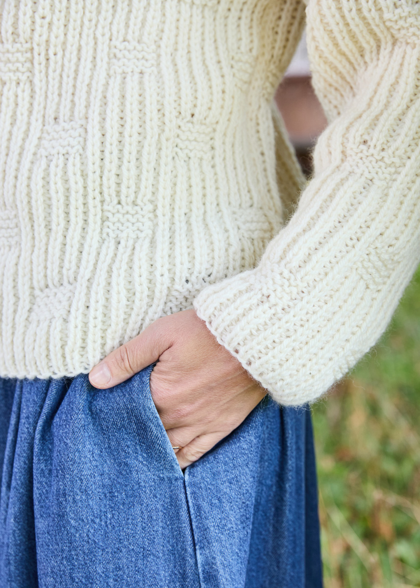 Lana Grossa-Qualität „Landlust- Naturwolle“ (100 % norwegische Schurwolle, LL ca. 85 m/50 g), 700 g (750 g - 800 g) in Wollweiß (Fb 1); Stricknadeln Nr. 5 und Nr. 6, 1 Rundstricknadel Nr. 5, 40 cm lang.