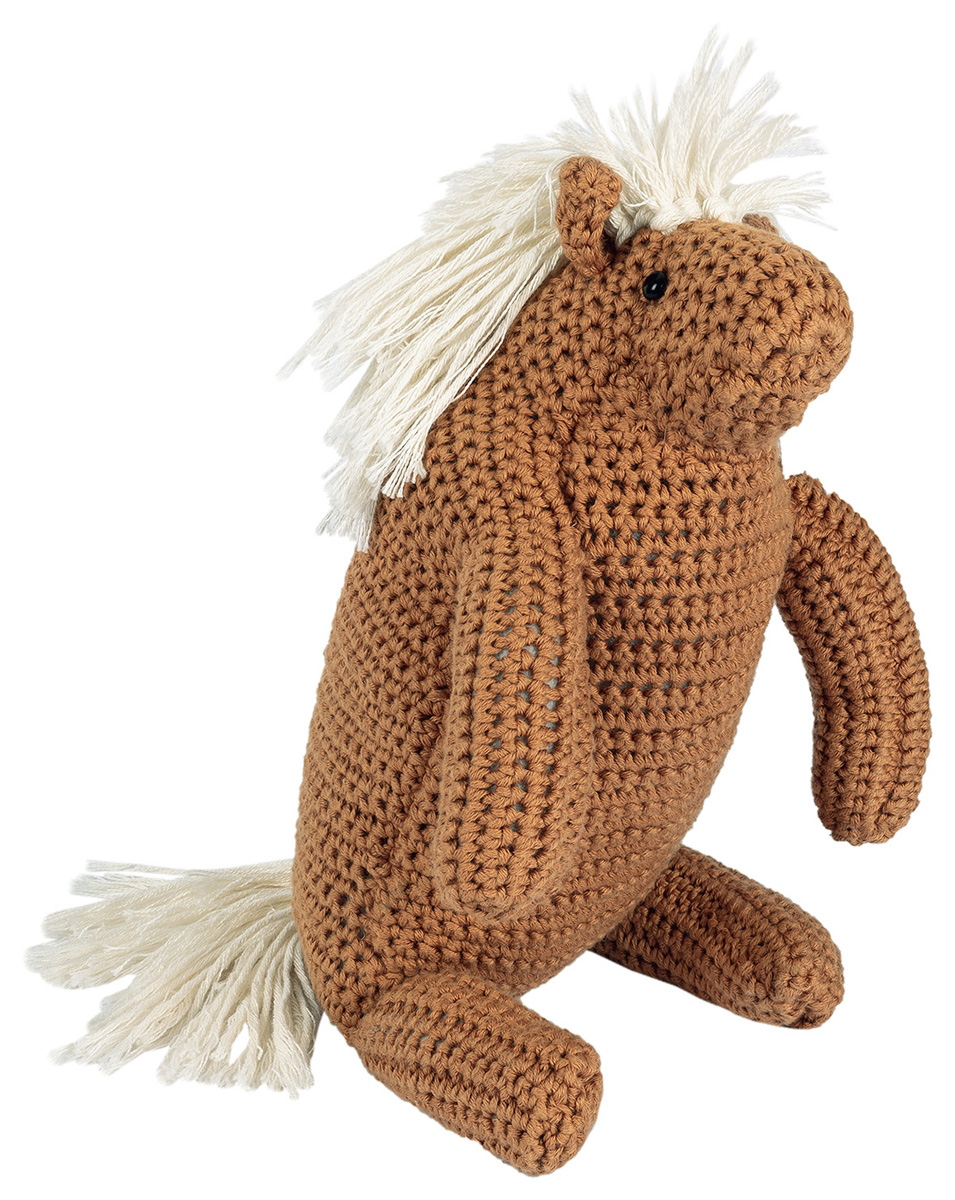 Lana Grossa Organico (100% Bio Baumwolle, Lauflänge 90 m/50 g), 150g Gelbbraun (Fb 133) und 50 g Ecru (Fb 6); 1 Häkelnadel Nr. 3,5 und 4,5, von UNION KNOPF 2 Tieraugen, Art. 49043, Fb 20, Gr. 8 mm,von PRYM 50 g Füllwatte Art. 968 210.