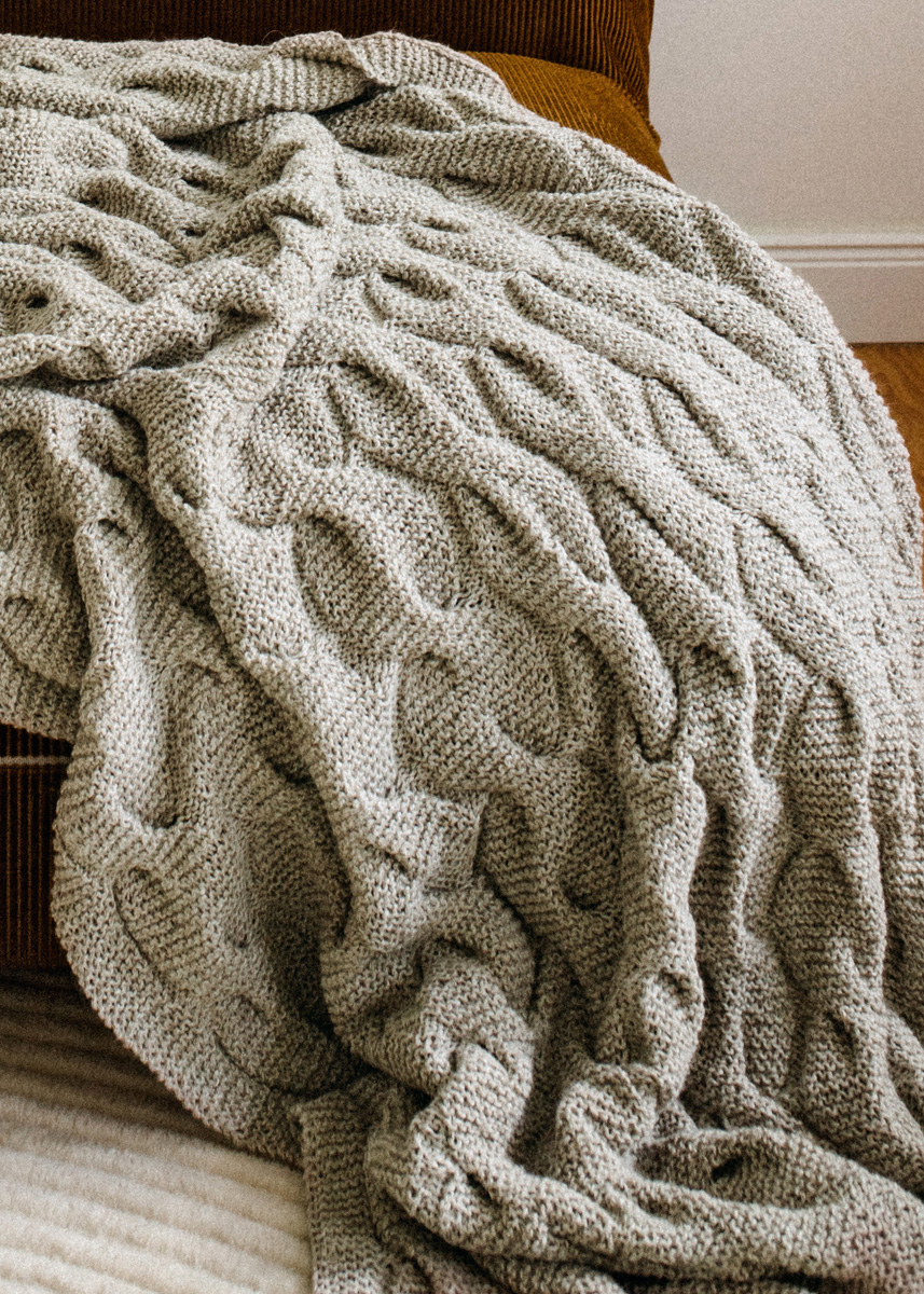 Lana Grossa-Qualität „Cara” (57 % (Baby) Alpaka, 33 % Baumwolle, 10 % Schurwolle (Merino), LL = ca. 120 m/50 g): ca. 950 g Beige (Fb. 3); 1 Rundstricknadel Nr. 4, 120 cm lang, 1 Zopfnadel.