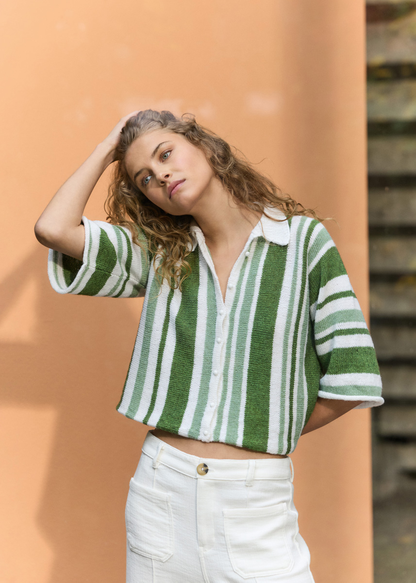 Lana Grossa-Qualität „Ecopuno“ (72 % Baumwolle, 17 % Schurwolle (Merino), 11 % Alpaka (Baby), LL = ca 215 m/50 g): ca 50 (100 - 100 - 100) g Resedagrün (Fb 20), ca 150 (200 - 200 - 250) g Weiß (Fb 26) und ca 100 (150 - 150 - 200) g Grasgrün (Fb 221); Stricknadeln Nr 3 und Nr 3,5; Häkelnadel Nr 3,5; 7 weiße Knöpfe, Durchmesser 10 mm.
