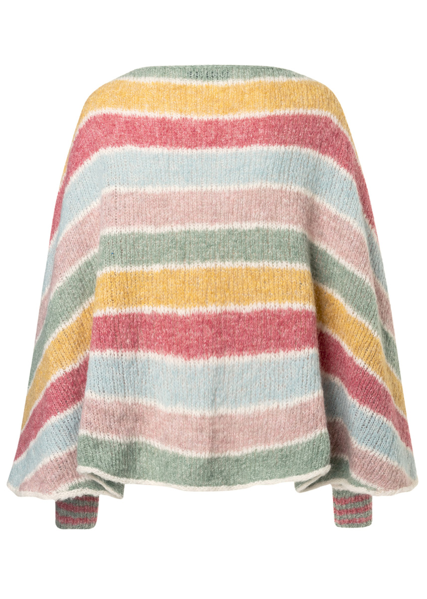 Bei unserem Poncho sind Vorder- und Rückteil nur durch Schulternähte und Ärmelbündchen verbunden. Die Streifen leuchten in den neuen, zarten Candy-Tönen und werden durch den geraden Ausschnitt betont.