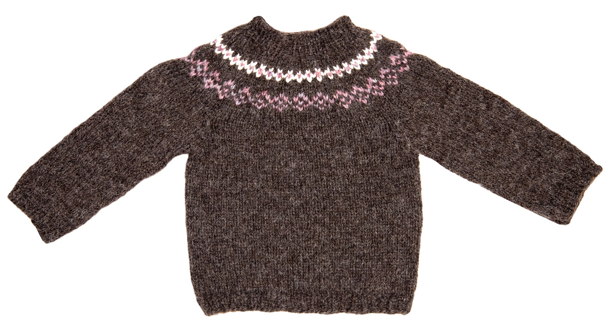 Lana Grossa Alta Moda Alpaca (90 % Alpaka, 5 % Schurwolle, 5 % Polyamid, Lauflänge 140 m/50 g) 100 (150/150/200) g Mokka meliert (Fb 10), 50 g Rohweiß (Fb 14) und 50 g Flieder meliert (Fb 44); Stricknadeln Nr. 4,5, eine 40 cm lange Rundstricknadel Nr. 4,5.
