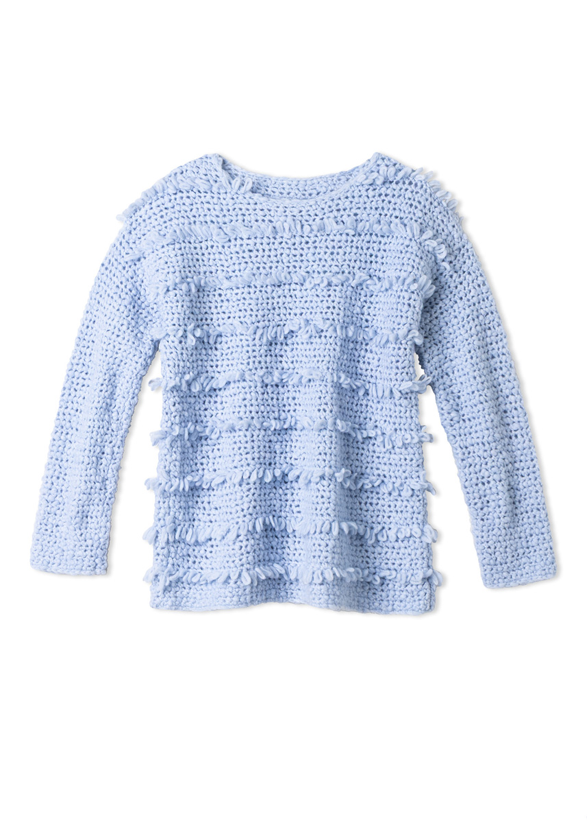 Lana Grossa-Qualität „Caramella” (53 % Schurwolle (Merino), 25 % (Baby) Alpaka, 22 % Polyamid, LL = ca. 110 m/50 g): ca. 500 (550 – 600) g Babyblau (Fb. 10); 1 Wollhäkelnadel Nr. 8.
