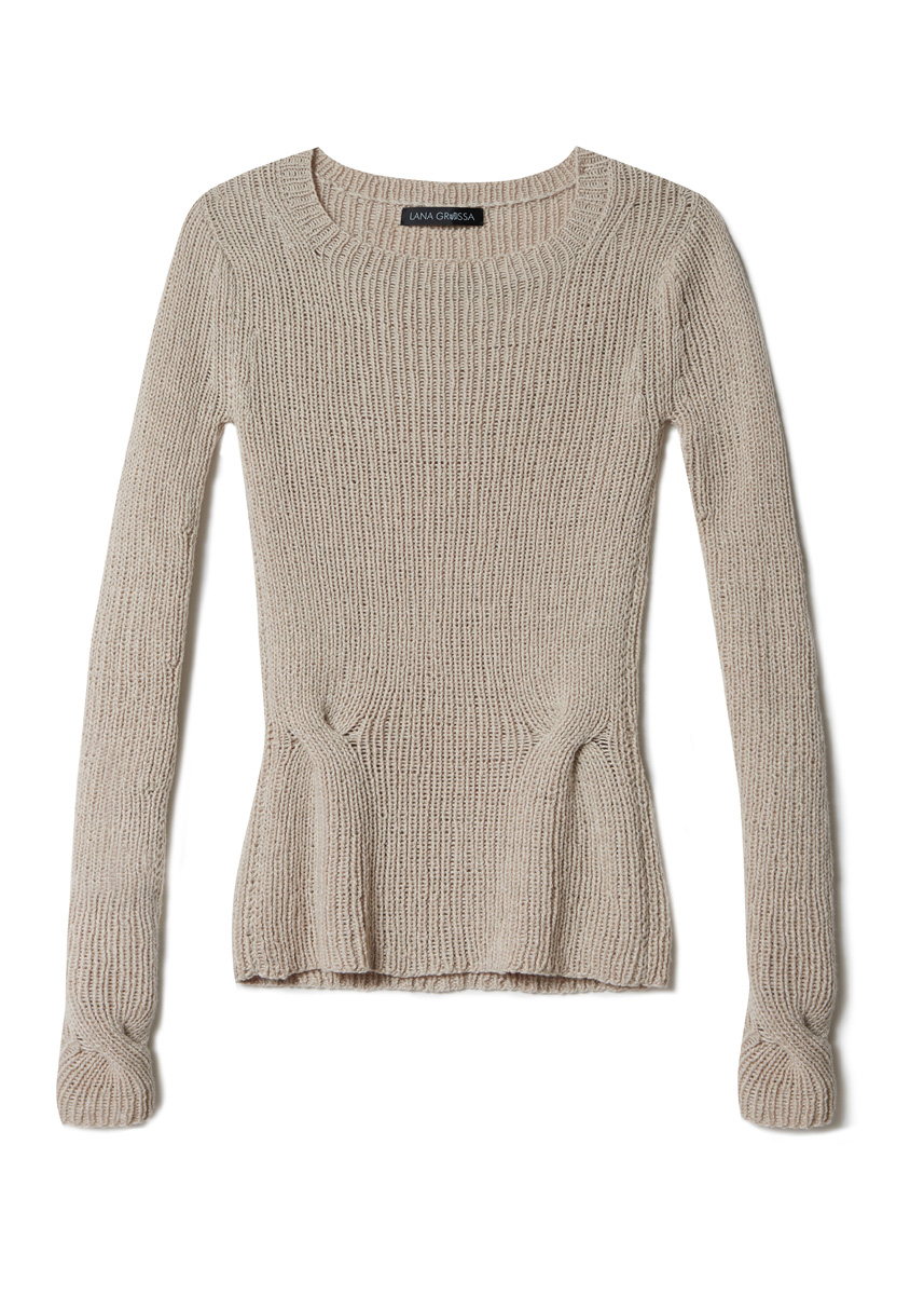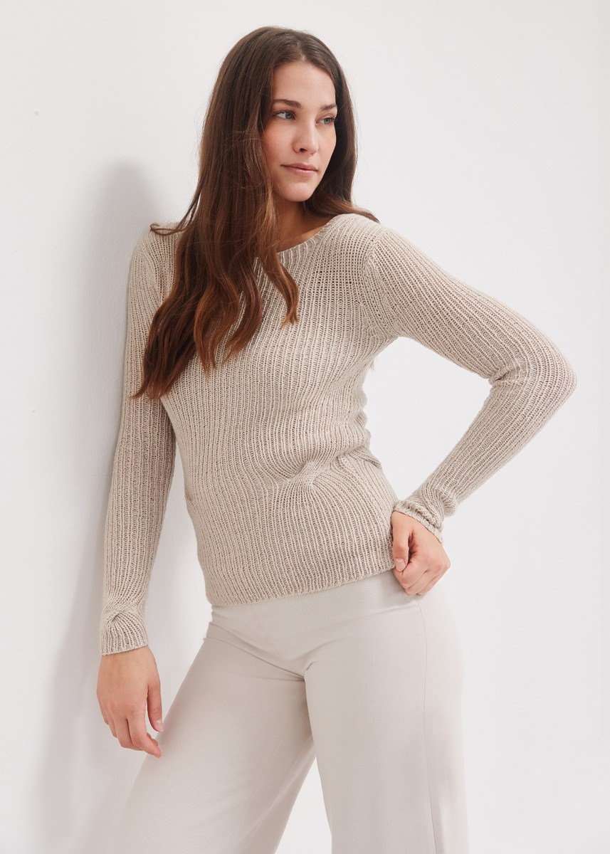 Lana Grossa-Qualität „Alta Moda Cotolana“ (45 % Schurwolle (Merino), 45 % Baumwolle (Pima), 10 % Polyamid, LL = ca 150 m/50 g): ca 350 (400 - 450 - 500) g Beige (Fb 57); Stricknadeln Nr 3 und Nr 3,5; 1 Zopfnadel; 1 kurze Rundstricknadel Nr 3.