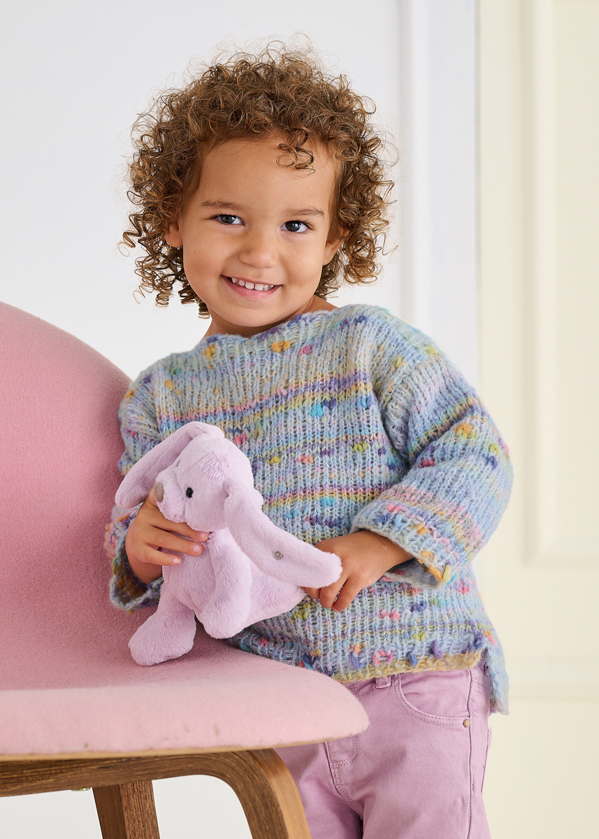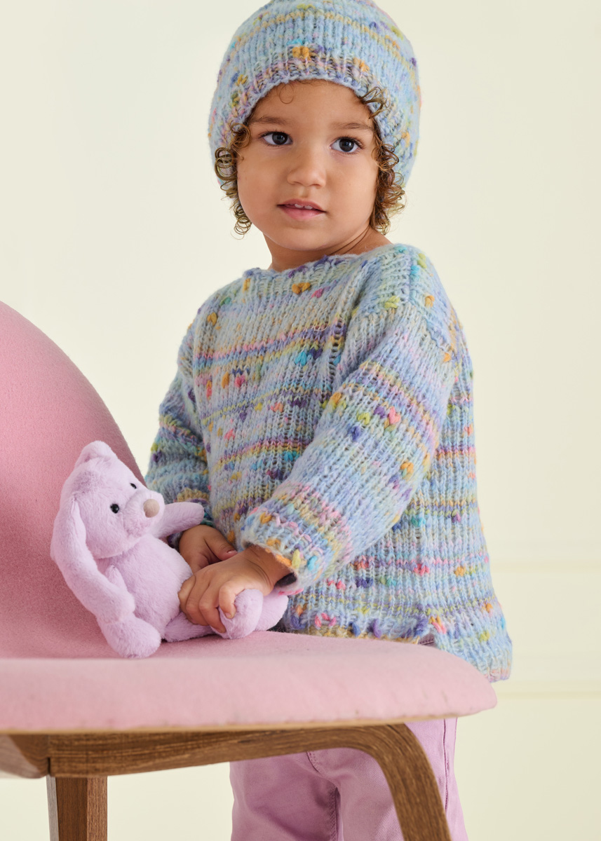 Lana Grossa Cassata (54% Schurwolle (Merino extrafine), 30% Polyamid, 16% Baumwolle); LL = 175 m/50 g): 50 (100/100/100/150) g Hellblau/Pink/Gelb/ Orange/Blaulila (Fb. 5); eine Rundstricknadel 5 mm; 2 Maschenmarkierer.