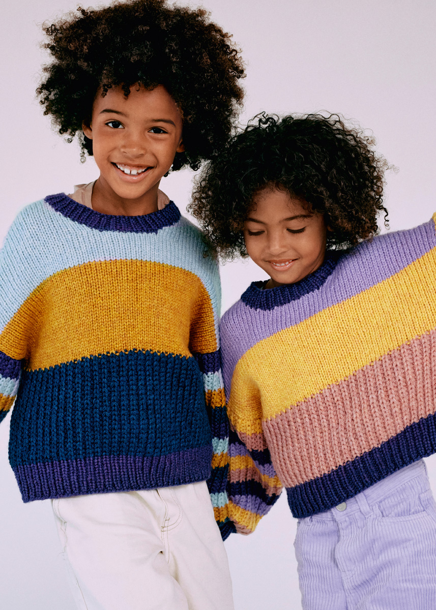Lana Grossa Cool Merino Big (90% Schurwolle (Merino), 10% Polyamid, Lauflänge 90 m/50 g), 150 (200 – 200) g Dunkelpetrol (Fb. 207), 100 (150 – 150) g Goldgelb (Fb. 214), 100 (150 – 150) g Dunkelviolett (Fb. 230) und 100 (150 – 150) g Hellbau (Fb. 208); je 1 Rundstricknadel Nr. 5,5 und 6, 40 und 60 cm lang, sowie 1 Häkelnadel Nr. 5.