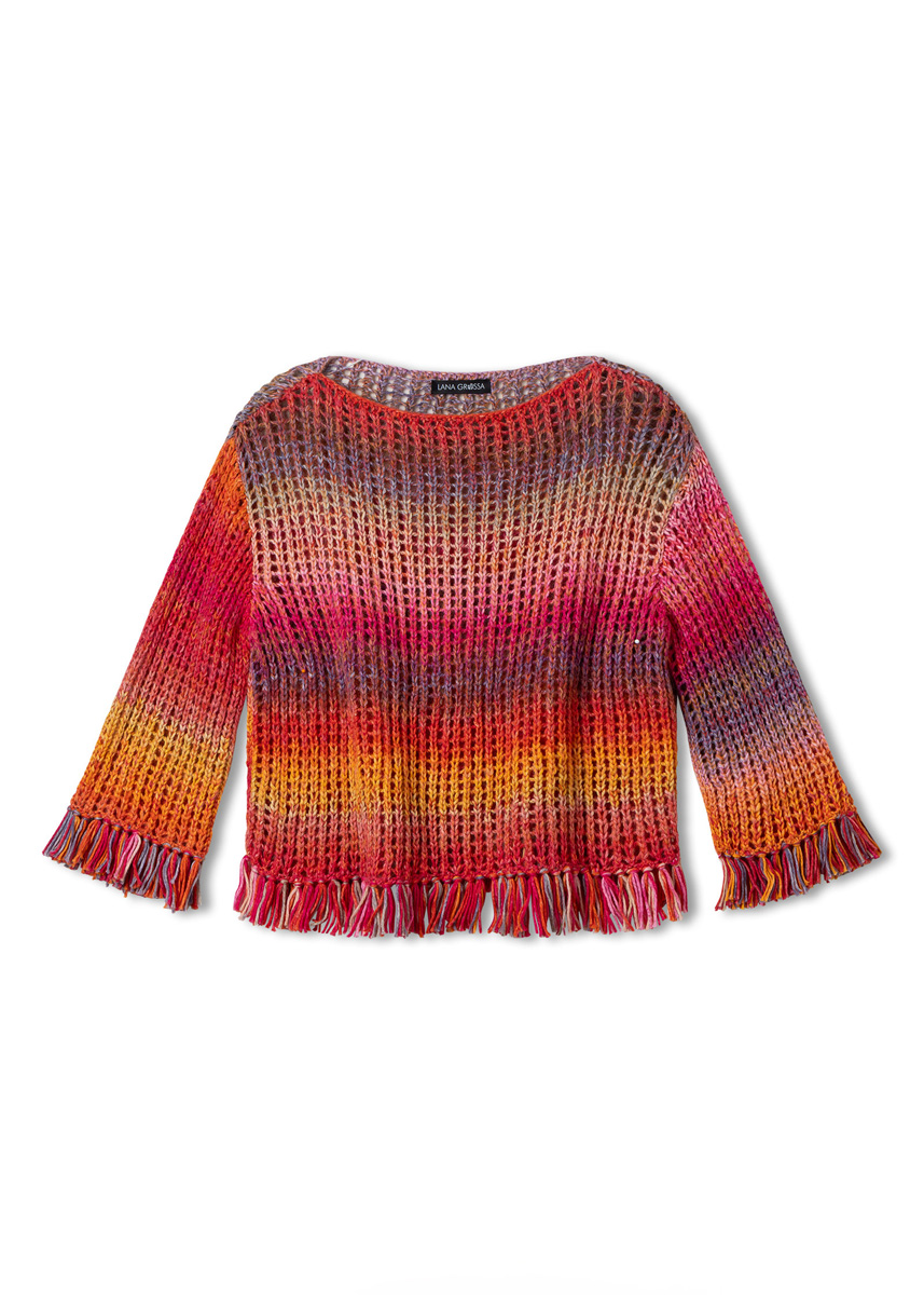Lana Grossa Cotonella (100% (Pima) Baumwolle, Lauflänge 280 m/100 g), 300 (300) g in Camel/Pink/Fuchsia/ Rotviolett/Grau/Flieder/Gelborange/Rot/Gelb (Fb 19) und Lana Grossa Cottonhair (70% Mohair (Superkid), 30% Baumwolle, Lauflänge 450 m/50 g), 100 (100) g in Hummer/Orange/Hellorange/ Pink/Fuchsia/Rost (Fb 101); Stricknadeln Nr 4 und Nr 6, 1 Häkelnadel Nr 5.