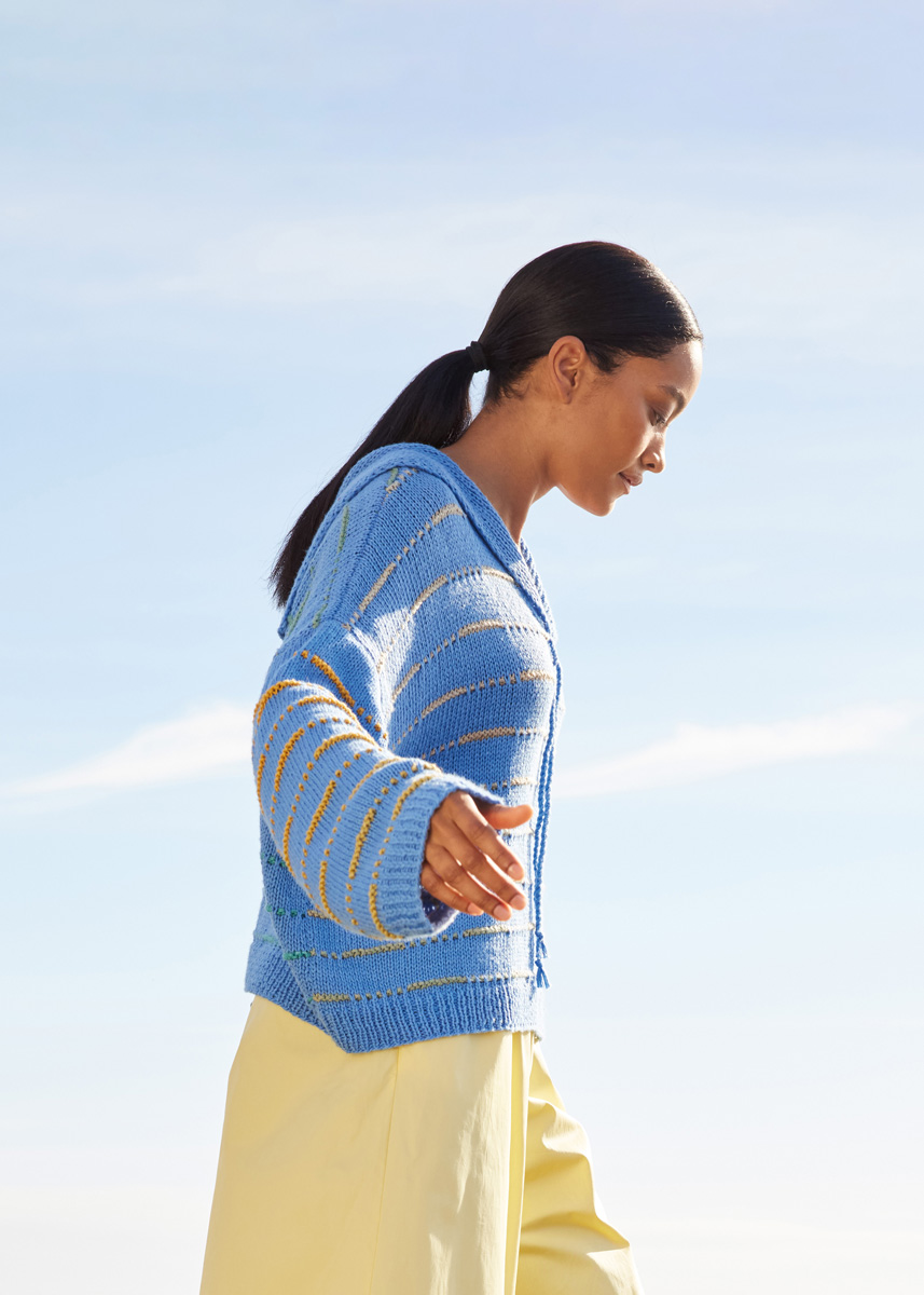 Lana Grossa Cotonella (100% (Pima) Baumwolle, Lauflänge 280 m/100 g), 400 (500 - 500) g in Himmelblau (Fb 208) und 100 (100 - 100) g in Graugrün/Braun/Gold-/ Sonnengelb/Pastellblau/Pfirsich/Grünbeige/Türkis (Fb 14); Stricknadeln Nr 3 und Nr 5.