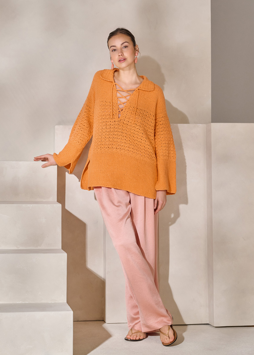 Lana Grossa Cotonella 50g (100% (Pima) Baumwolle, Lauflänge 140 m/50 g), 600 (600 – 700) g Mandarin (Fb. 203); Stricknadeln Nr. 4,5, je 1 Häkelnadel Nr. 4, 4,5 und 5.