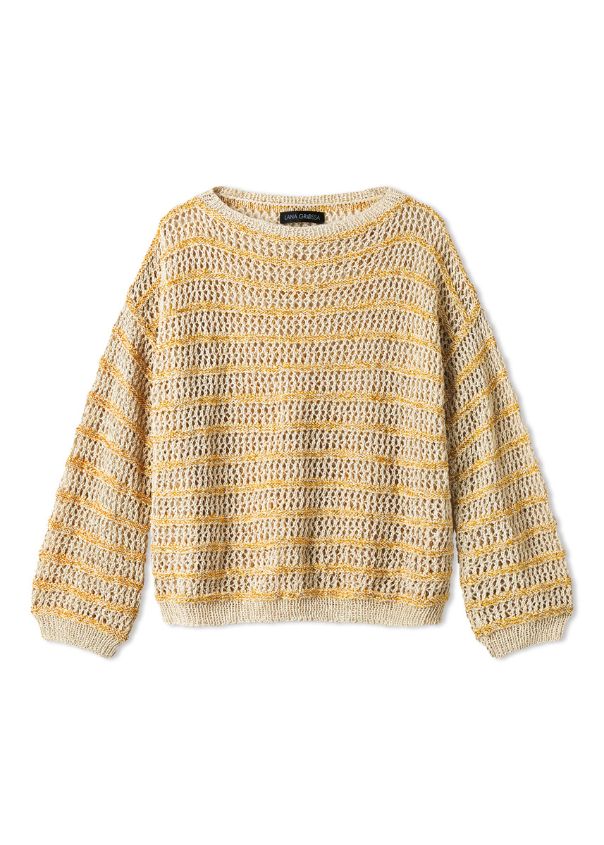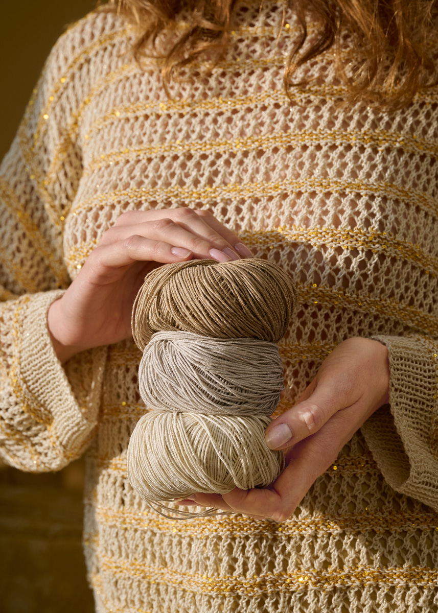 Lana Grossa-Qualität „Filo Lurex“ (94 % Baumwolle, 6 % Polyester, LL = ca 145 m/50): ca 400 (400 - 450 - 450) g Creme (Fb 2); Lana Grossa-Qualität „Glamour“ (55 % Polyamid, 45 % Polyester, LL = ca 115 m/25 g): ca 100 (100 - 125 - 125) g Goldgelb (Fb 18); Stricknadeln Nr 3 und Nr 3,5; 1 kurze Rundstricknadel Nr 3.
