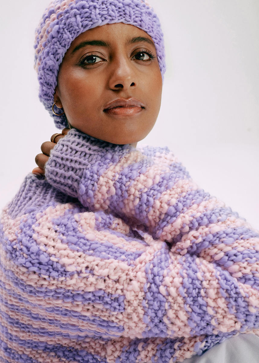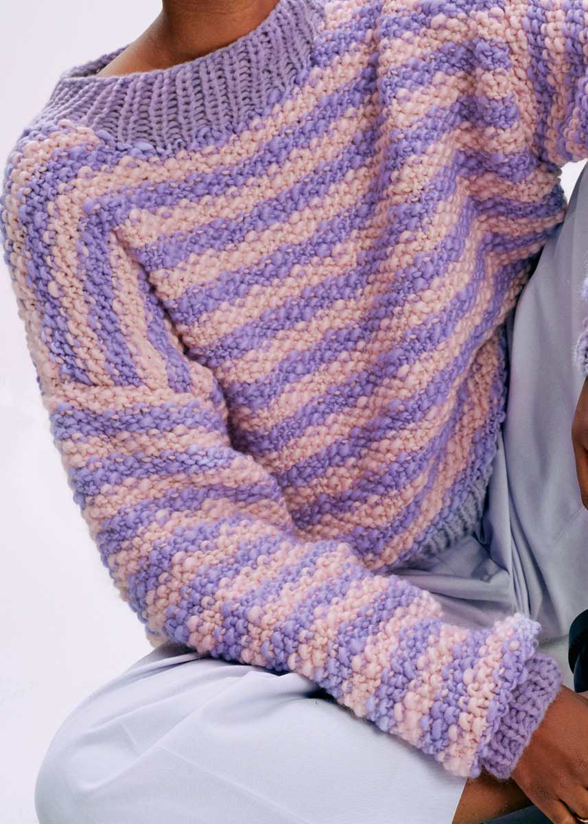 Lana Grossa-Qualität „Lala Berlin Flamy“ (100 % Schurwolle (Merino), LL = ca 70 m/100 g): ca 500 (600 - 600 - 700) g Flieder (Fb 11) und ca 500 (600 - 600 - 700) g Rosa (Fb 8); Lana Grossa-Qualität „Lala Berlin Lovely Cotton“ (75 % Schurwolle (Merino superfein), 25 % Baumwolle, LL = ca 90 m/50 g): ca 100 (150 - 150 - 200) g Flieder (Fb 29); Stricknadeln Nr 7; 1 kurze Rundstricknadel Nr 7.