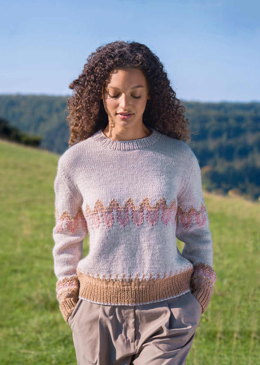 Hier wird die Passform des Pullovers durch Schulterschrägen und dezente Armkugeln optimiert. Das Jacquard-Muster besteht aus rechten und linken Maschen, was neu und interessant aussieht.