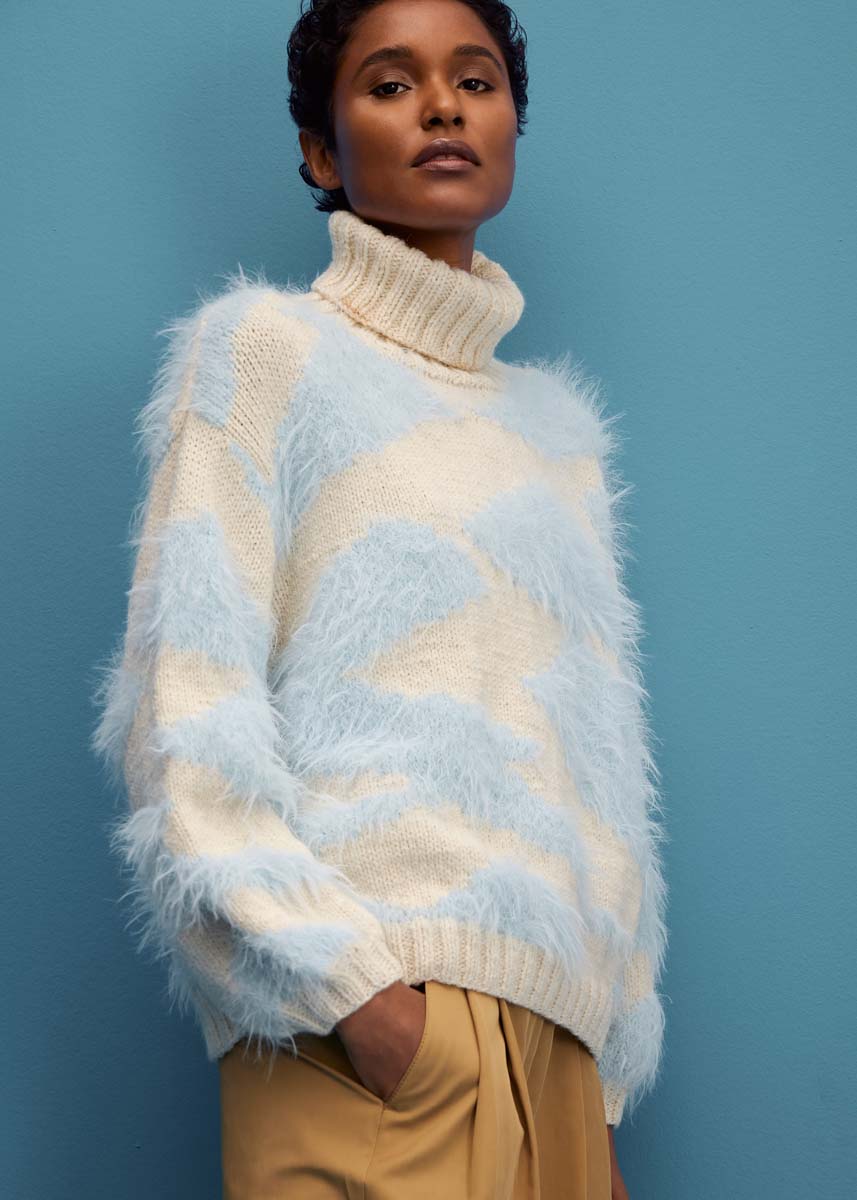 Von einer Winterlandschaft inspiriert wirken die eingestrickten, zartblauen Passagen auf rohweißem Grund. Zugegeben, die Intarsientechnik ist etwas tricky – aber die Mühe lohnt sich, wenn das Ergebnis so sensationell ist.