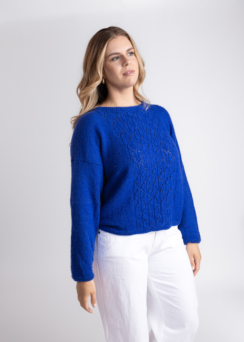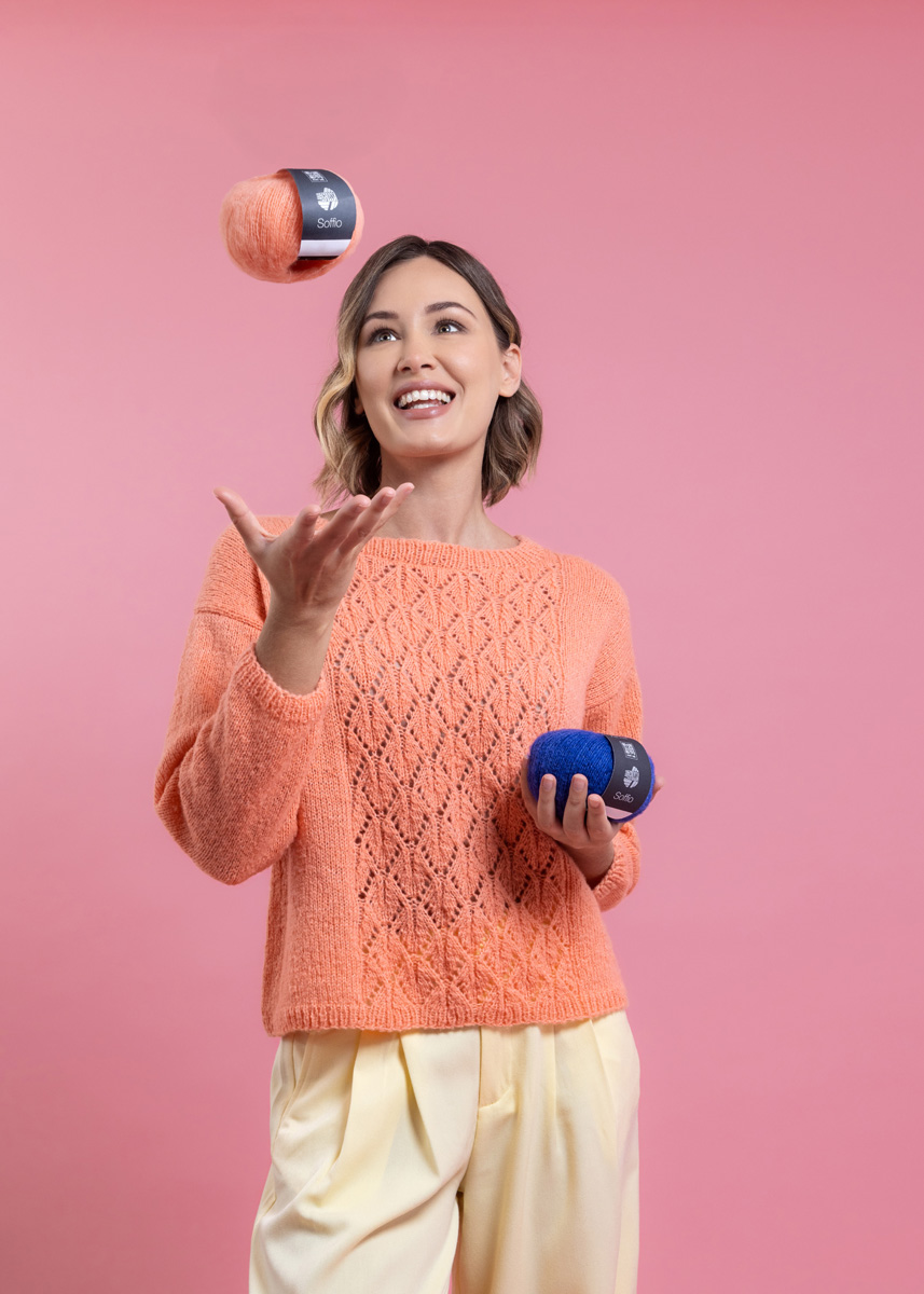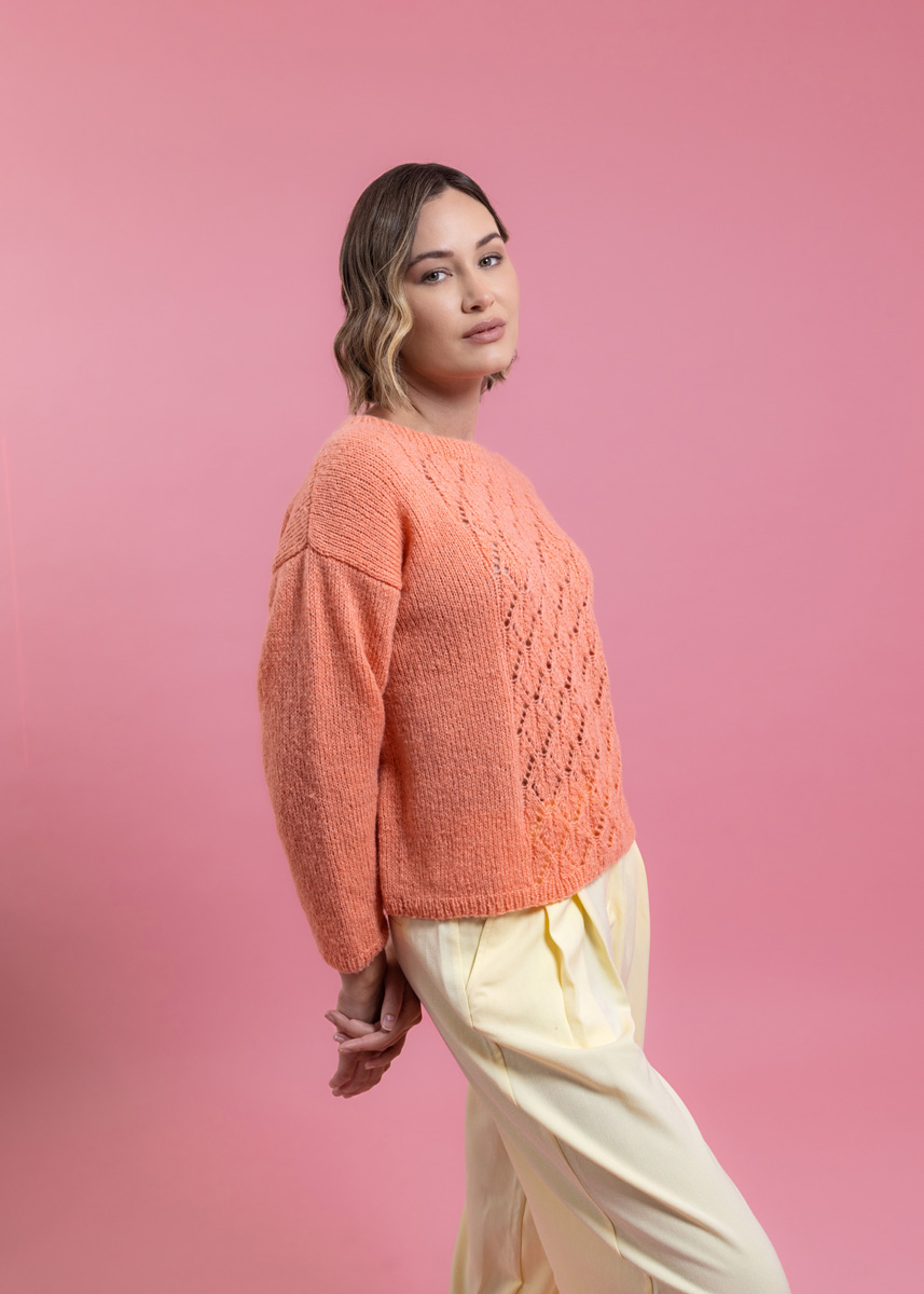 Der Pullover wird durchgehend mit doppeltem Faden gestrickt. Er hat eine Gesamtlänge von 53 (55 - 57 - 59 - 61 - 63) cm und eine Brustmehrweite von 22 cm bei 80 cm Brustumfang (18 cm bei 88 cm Brustumfang - 14 cm bei 96 cm Brustumfang - 14 cm bei 104 cm Brustumfang - 10 cm bei 116 cm Brustumfang - 10 cm bei 128 cm Brustumfang).