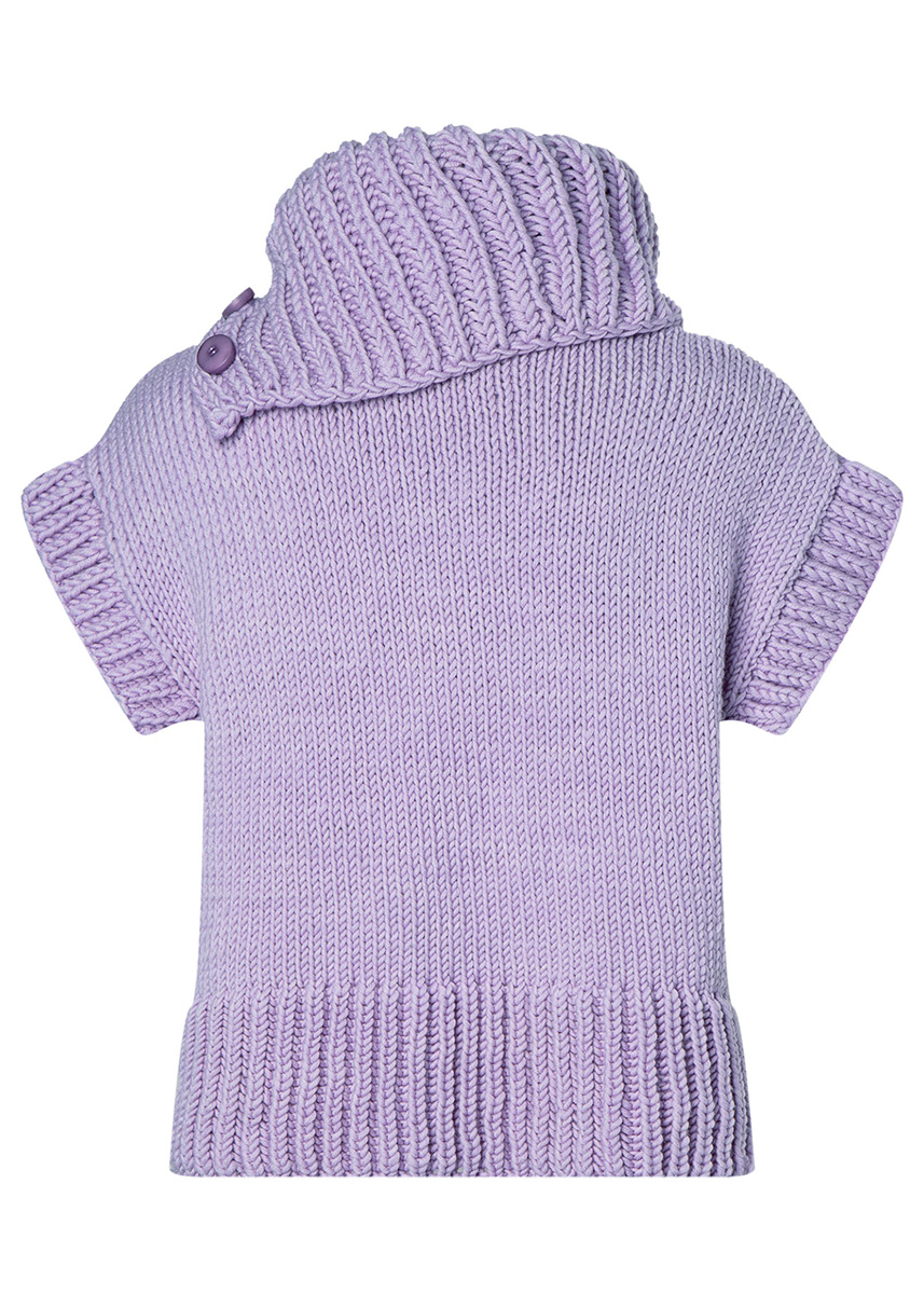 Lana Grossa Superbingo (100% Schurwolle (Merino), Lauflänge 55 m/50 g), 750 (800 – 850) g Flieder (Fb 109); Stricknadeln Nr. 7, je 1 Rundstricknadel Nr. 6 und 7, 40 cm lang, 3 Knöpfe von UNION KNOPF, Fb Flieder, Gr. 25 mm.