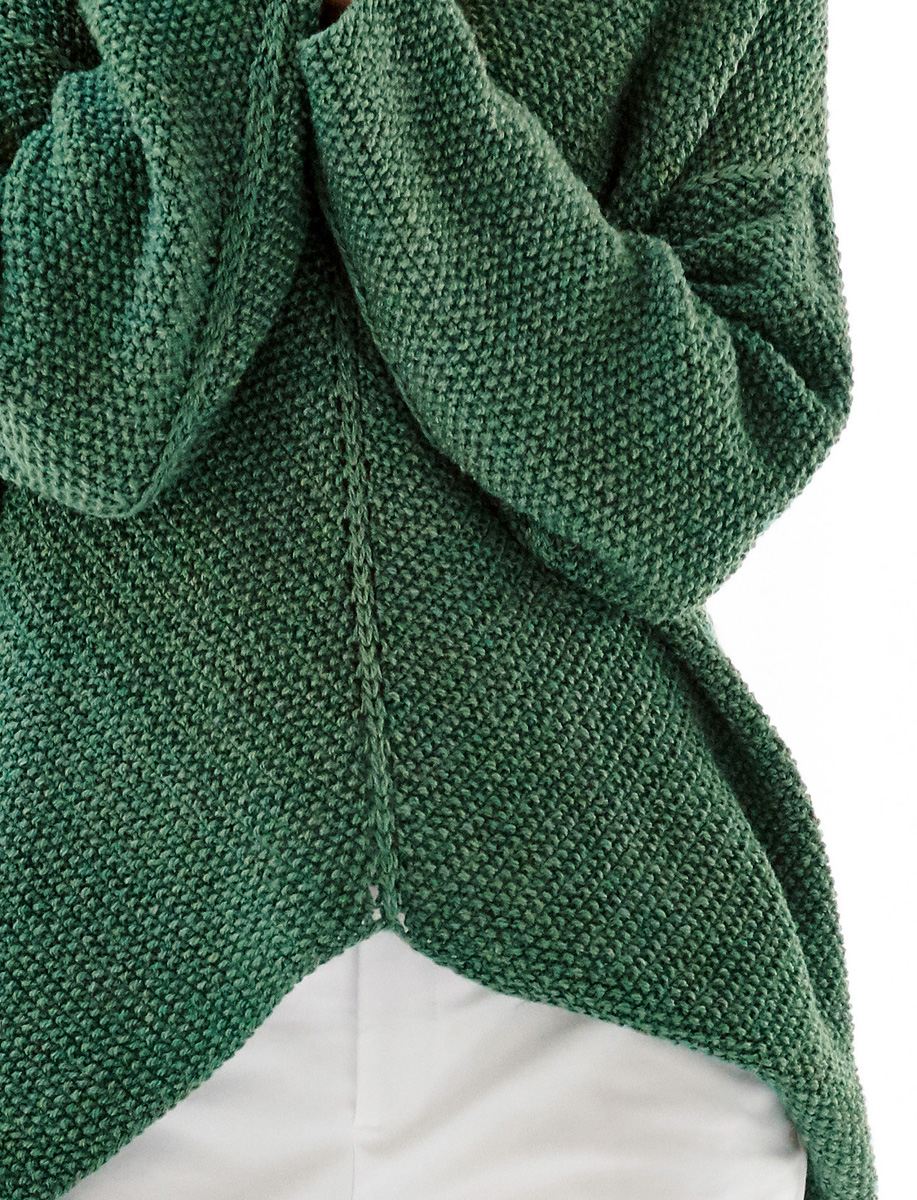 Die interessante Form des Pullis entsteht durch geschickte Zu- und Abnahmen in der vorderen Mitte. Das ist einfacher als es aussieht und hat einen spannenden Effekt.
