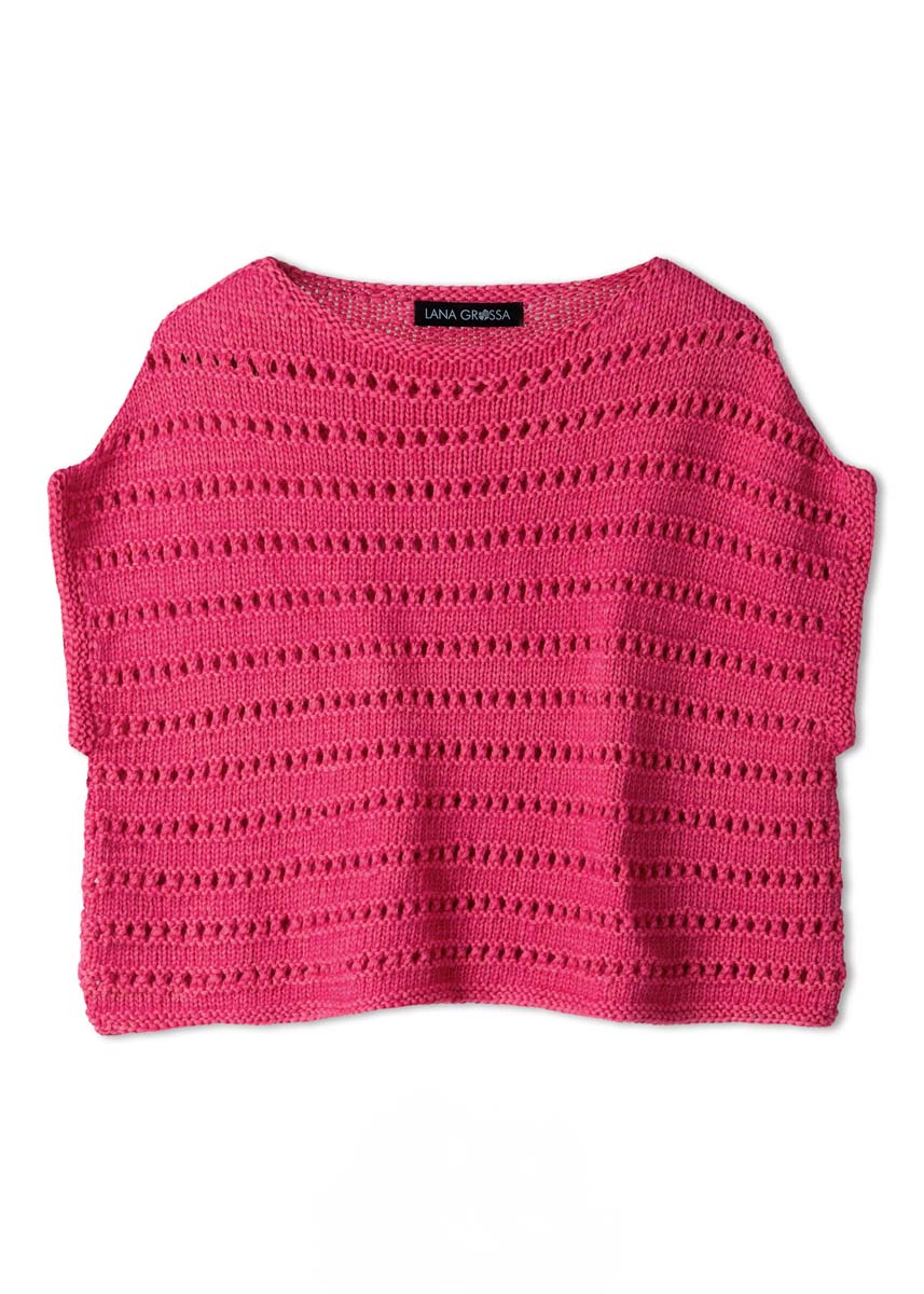 Lana Grossa-Qualität „Summer Softness“ (80 % Baumwolle (Bio), 20 % Schurwolle (Merino Superfine), LL = ca 130 m/50 g): ca 250 (300 - 300 - 350) g Pink (Fb 8); kurze und längere Rundstricknadeln Nr 4,5; Maschenmarkierer.