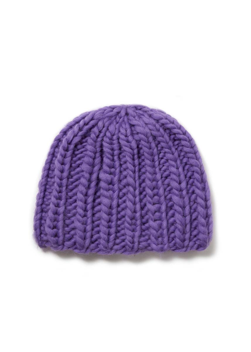 Lana Grossa-Qualität „Confetti” (100 % Schurwolle (Merino), LL = ca. 50 m/100 g): ca. 100 g Violett (Fb. 104); Spielstricknadeln Nr. 12.