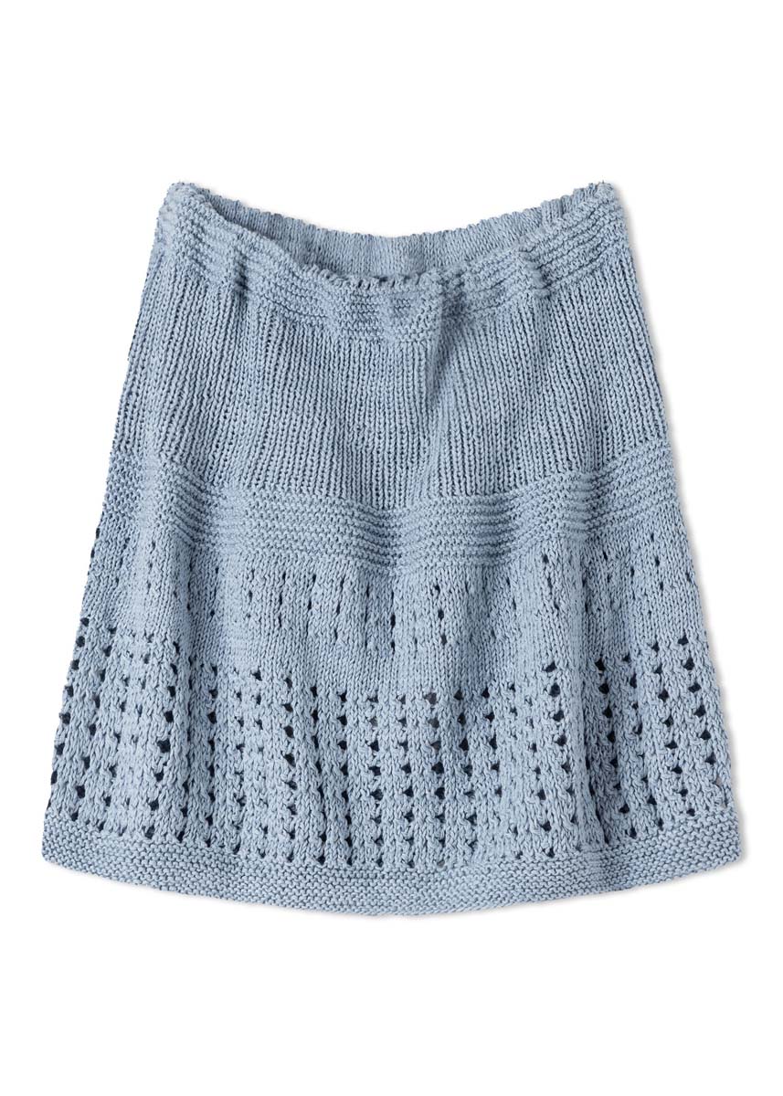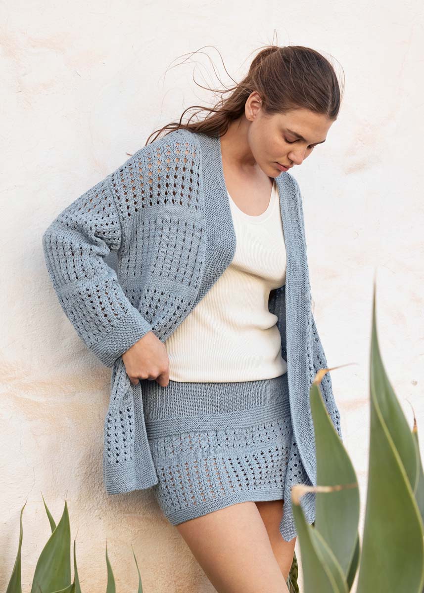 Ruhiges Graublau, klare Linien und ein grafischer Lochmustermix setzen bei diesem Set coole Akzente. Die kraus gestrickten Blenden verleihen dem Cardigan einen kompakten, sauberen Rahmen.
