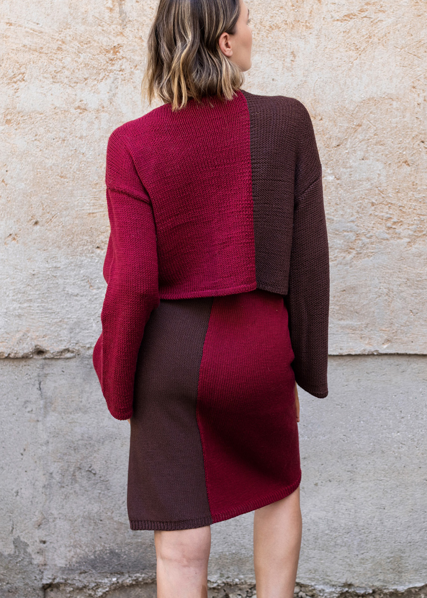 Das Modell hat eine Gesamtlänge von 58 (60 - 62 - 64 - 68 - 68) cm, einen Taillenumfang von 62 (70 - 78 - 86 - 98 - 110) cm und einen Hüftumfang von 87 (94 - 102 - 110 - 122 - 134) cm. Der Rock wird in Reihen von unten nach oben gestrickt und am Ende über dem Schlitz zusammengenäht.