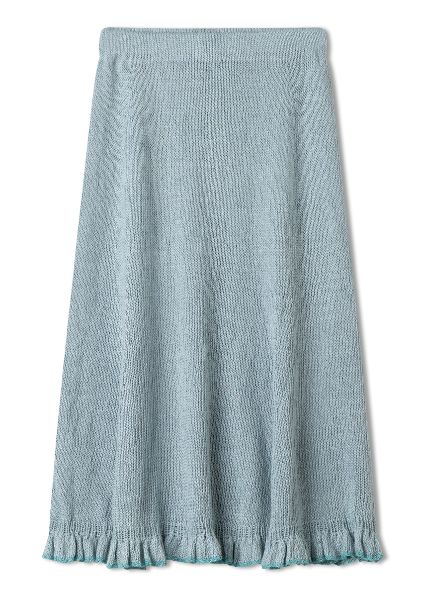 Lana Grossa Tencellino (51% Leinen, 49% Tencel, LL = ca. 125 m/50 g), 450 (500 - 550) g in Eisblau (Fb 9). Lana Grossa Filo Paillettes (55% Baumwolle, 39% Polyester, 6% Polyamid, LL = ca. 155 m/50 g), 50 g in Türkis (Fb 11). Je eine 80 cm lange sowie 120 cm oder 150 cm lange Rundstricknd Nr. 3,5 und Nr. 4. 10 MM. Ca. 75 (85 - 95) cm Gummiband, 4 cm breit.