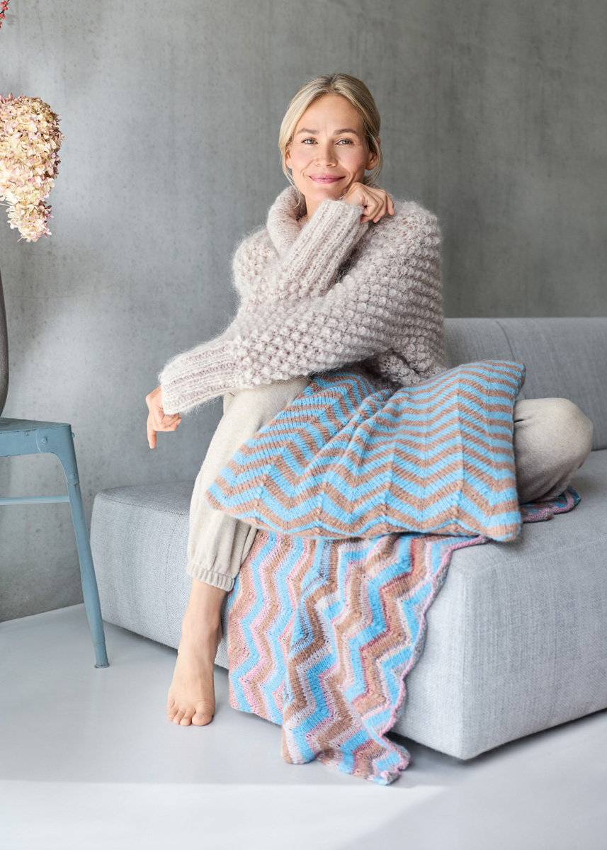 Lana Grossa-Qualität „Mohair Moda” (70 % Mohair (Kid Mohair), 20 % Schurwolle (Merino superfine), 10 % Polyamid, LL = ca. 140 m/50 g): ca. 600 (650 – 700) g Beige (Fb. 11); Stricknadeln Nr. 7 und 10, je 1 Rundstricknadel Nr. 7 und 10, 60 cm lang, Spielstricknadeln Nr. 7.