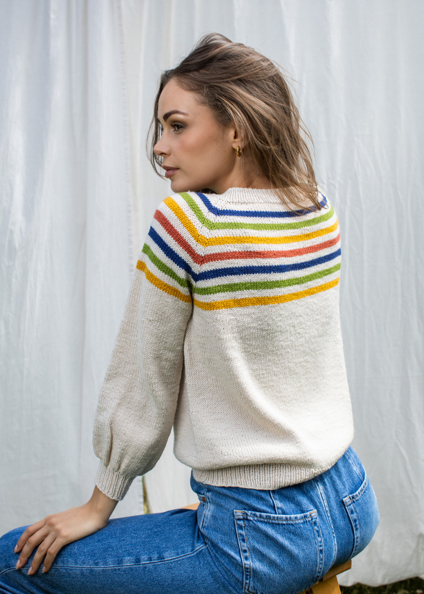 Der Pullover wird nahtlos in einem Stück von oben nach unten gestrickt und hat eine Gesamtlänge von 54 (56 - 58 - 60 - 62 - 64) cm und eine Brustmehrweite von 10 cm bei 80 (88 - 96 - 104 - 116 - 128) cm Brustumfang.
