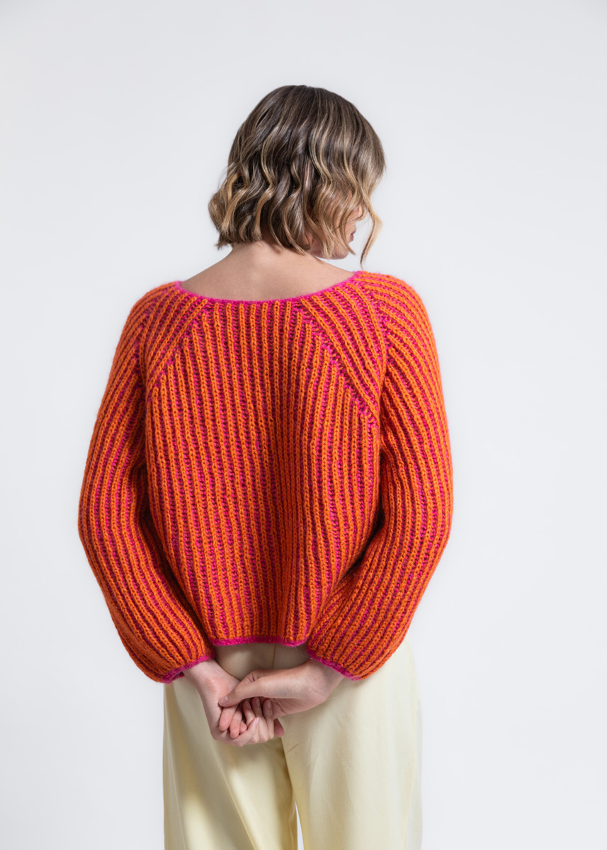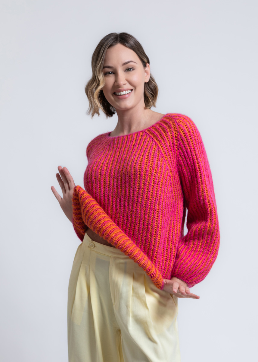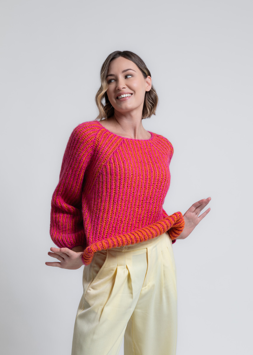 Der Pullover wird nahtlos in einem Stück von oben nach unten gestrickt und ist beidseitig tragbar. Er hat eine Gesamtlänge von 53 (55 - 57 - 59 - 61 - 63) cm und eine Brustmehrweite von 32 cm bei 80 cm Brustumfang (32 cm bei 88 cm Brustumfang - 32 cm bei 96 cm Brustumfang - 33 cm bei 104 cm Brustumfang - 29 cm bei 116 cm Brustumfang - 26 cm bei 128 cm Brustumfang).