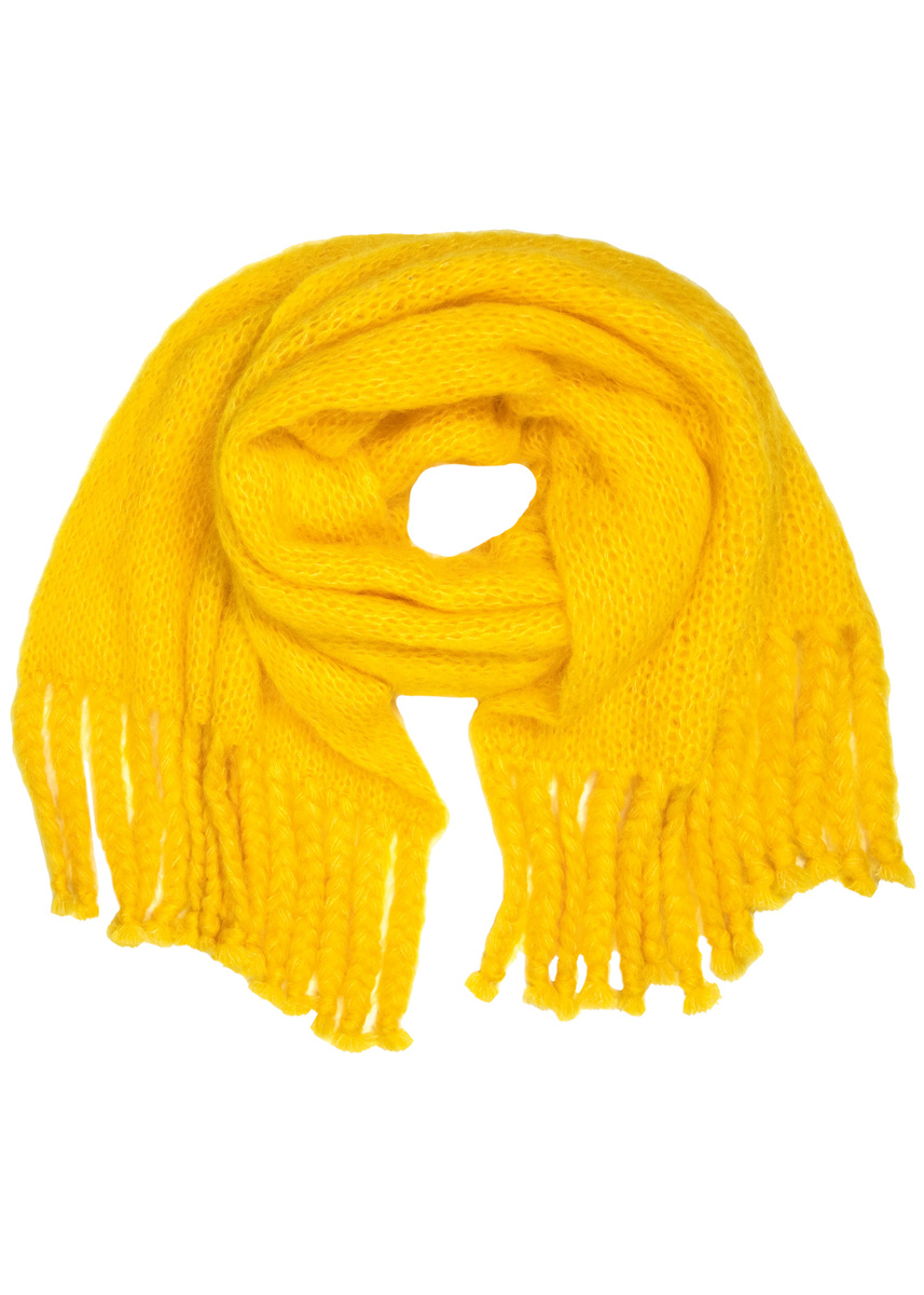 Lana Grossa „Brigitte No. 3“ (40% Mohair, 37% Schurwolle Merino, 23% Polyamid; Lauflänge ca. 100 m/25 g), 450 g in Gelb (Fb 1); Rundnadel Nr. 9 in 60 cm Länge.