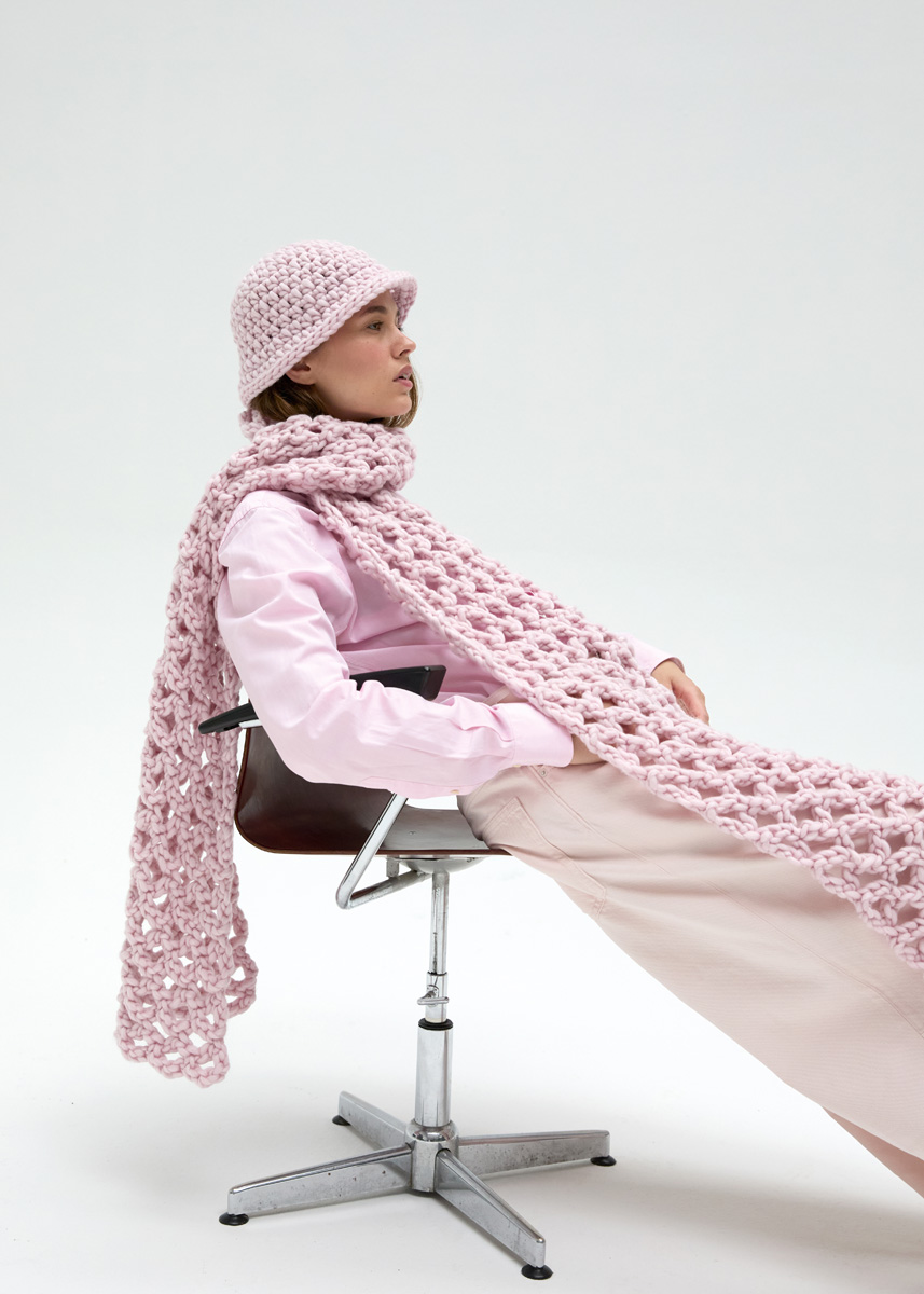 Lana Grossa „Confetti“ (100 % Schurwolle (Merino extrafine), LL = 50 m/100 g): 600 g Rosé (Fb 914); Häkelnadel Nr 8.