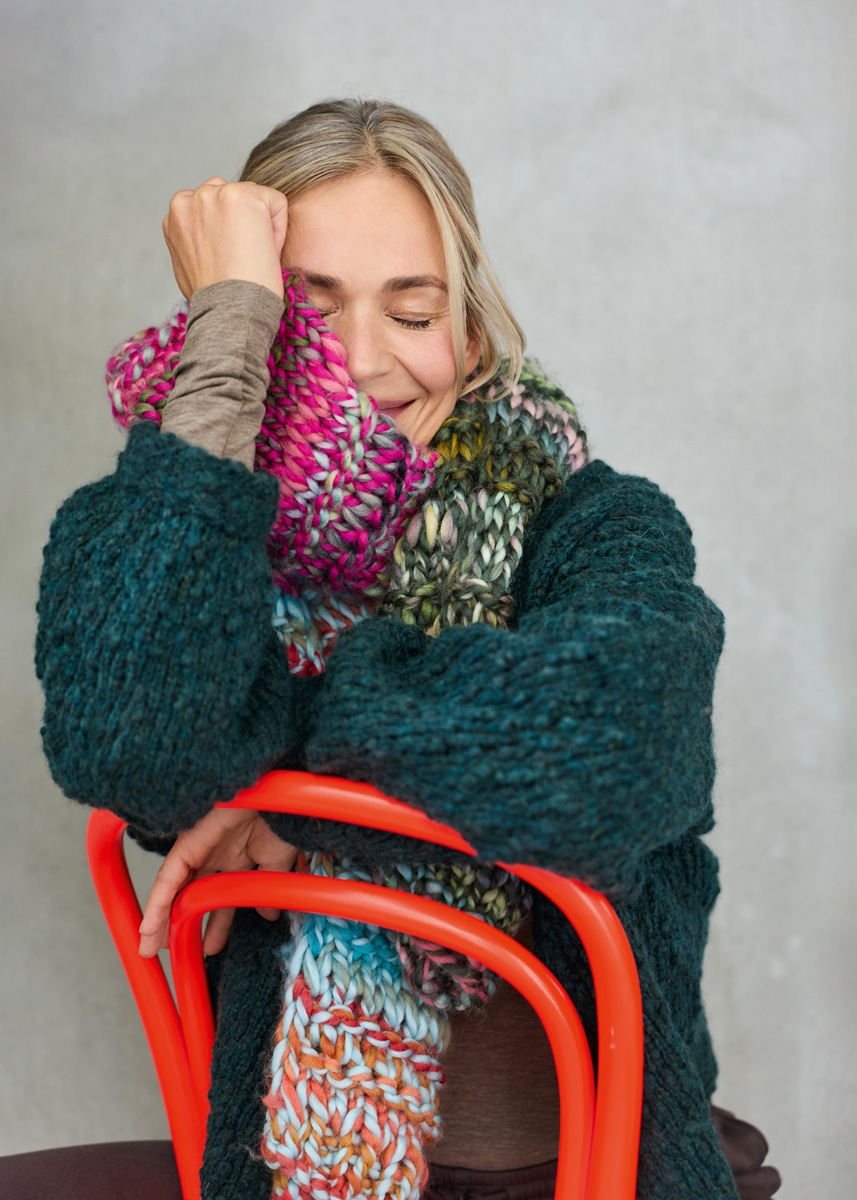 Lana Grossa-Qualität „Dolce” (100 % Schurwolle (Merino basolan), LL = ca. 50 m/100 g): ca. 200 g Pink/Rosa/Mintgrün/Oliv/Senf (Fb. 5) und je ca. 100 g Moosgrün/ Zartrosa/Mintgrün/Oliv/Senf (Fb. 4) und Mint/Rot/Hellpetrol/Rost (Fb. 8); Stricknadeln Nr. 12.