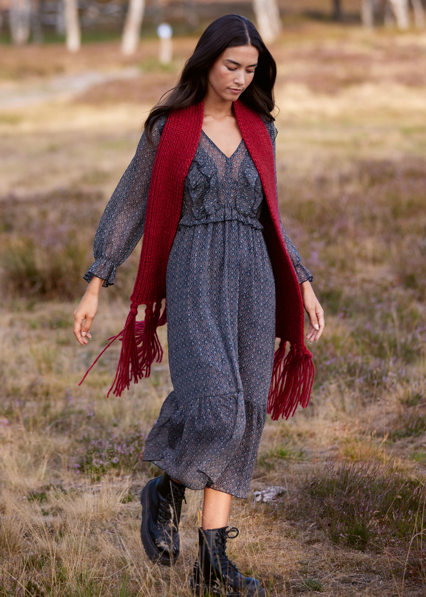 Lana Grossa Qualität „Ecopuno Chunky“ (48% Baumwolle, 33% Schurwolle (Merino extrafine), 19% (Baby) Alpaca, LL = 70 m/50 g): 250 g Weinrot (Fb. 118), Stricknadel Nr. 7, Häkelnadel Nr. 7.