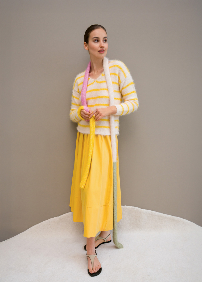 Lana Grossa Finito (73 % Baumwolle, 27 % Polyamid, LL 150 m/50 g), 50 g Olive/Creme (Fb 25), 50 g Vanille/ Creme (Fb 20), 50 g Pastellpink/Creme (Fb 18), 50 g Sonnengelb/ Creme (Fb 23); Rundstricknadel Nr 4, Länge 60 cm