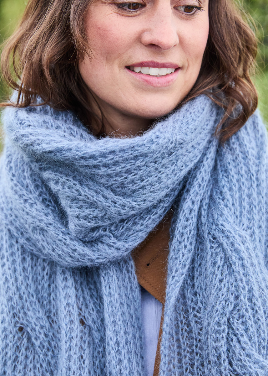 Lana Grossa-Qualität „Landlust- Kidmohair“ (70% Mohair (Superkid), 30% Baumwolle, LL ca. 225 m/25 g), 175 g in Graublau (Fb 8); Stricknadeln Nr. 4,5, 1 Hilfs- oder Zopfnadel.